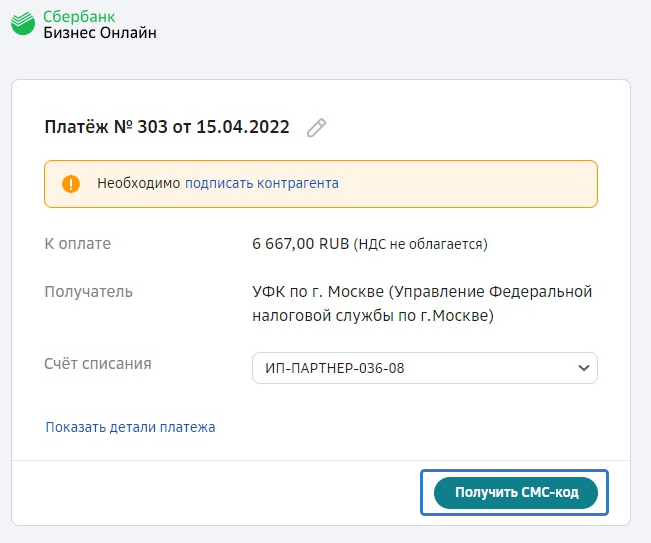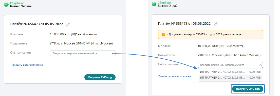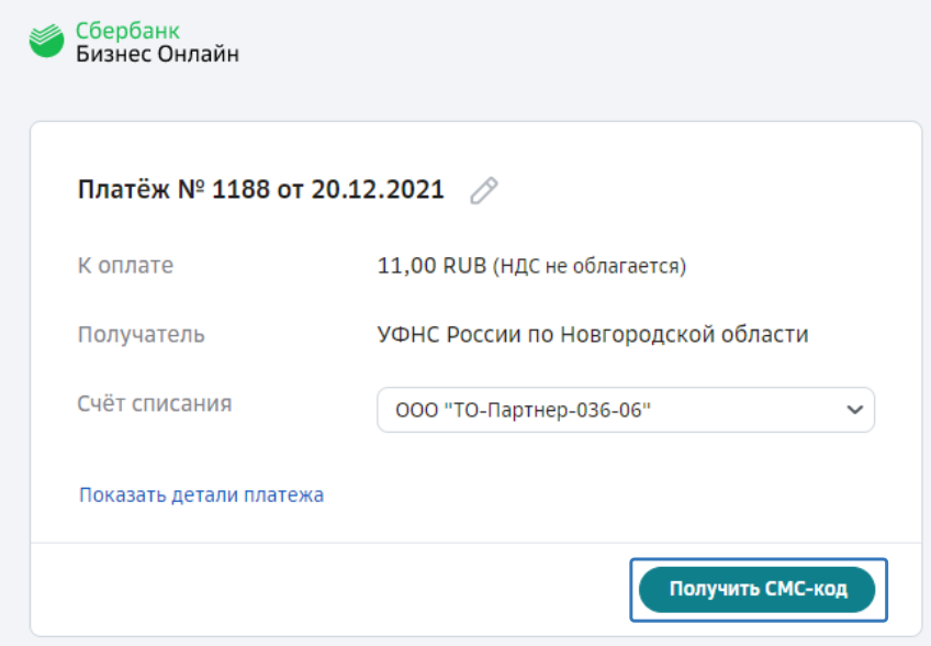 На странице подтверждения платежа, если у вас в личном кабинете сервиса два или более расчётных счетов с подключенной интеграцией со Сбербанком, необходимо выбрать расчетный счет, с которого будет произведена оплата. Для этого следует нажать на выпадающий список «Счет списания», выбрать требуемый расчётный счёт и нажать на кнопку «Получить СМС-код». После чего на странице подтверждения необходимо запросить СМС-код, а затем ввести его в соответствующее поле: