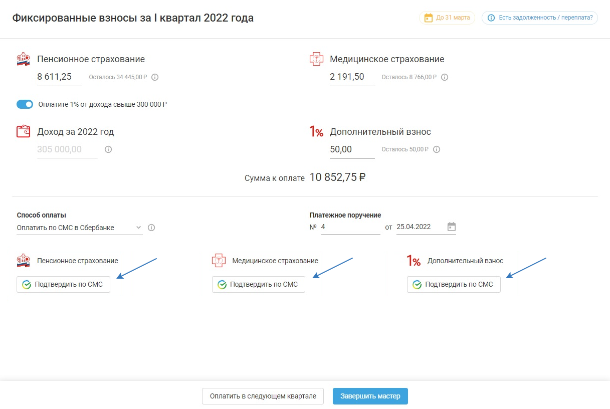 Платежи при данном способе оплачиваются поочередно. Для этого необходимо нажать на кнопку «Подтвердить по СМС» под соответствующим взносом: