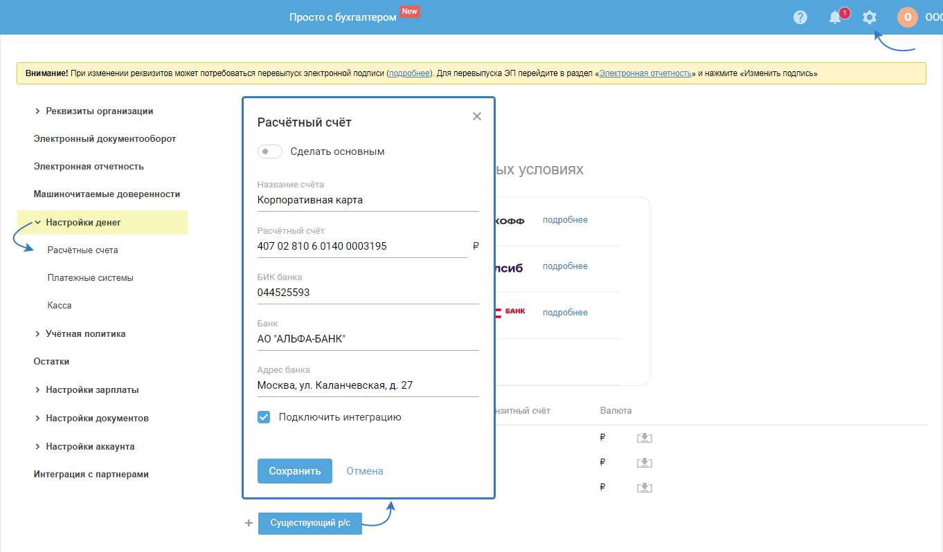 1) Счёт корпоративной карты укажите в закладке «Реквизиты — Расчётные счета», нажмите на «Существующий р/с» и заполните карточку счёта: