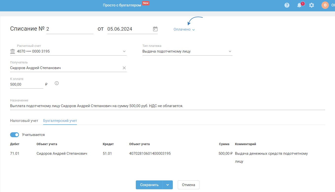 3) По дате списания с карты средств отразите эту операцию в разделе Банк через списание с типом «Выдача подотчётному лицу»: