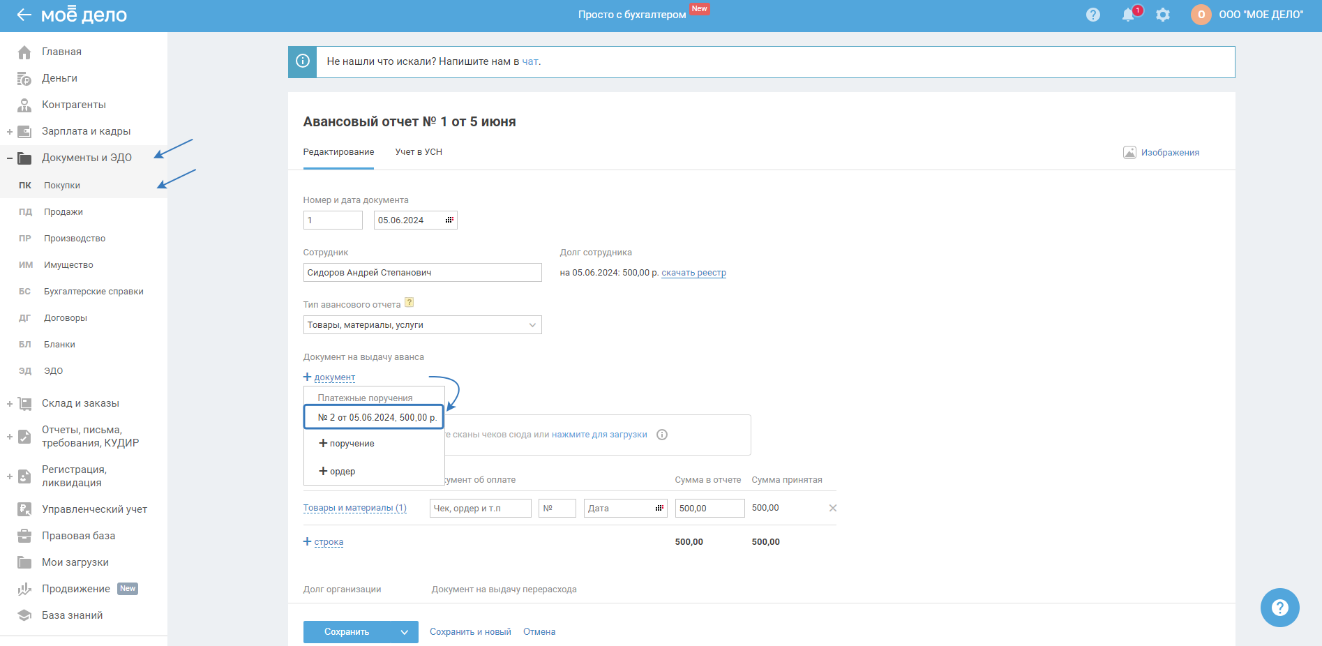4) Чтобы отчитаться за полученные под отчёт средства, в сервисе «Документы и ЭДО — Покупки — Авансовые отчёты», нужно составить авансовый отчёт. В нём перечислите осуществленные расходы и по строке «Документ на выдачу аванса» подтяните данные по п/п на выдачу денег под отчёт. Сохраните.