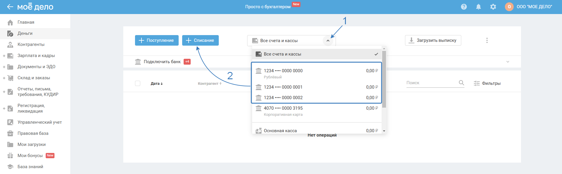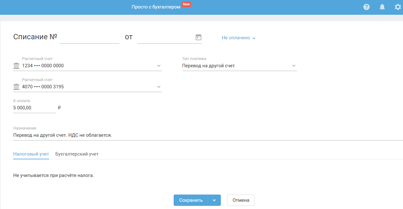 2) При переводе денежных средств с расчётного счёта на счёт корпоративной карты создайте в закладке «Деньги» списание с типом «Перевод на другой счёт»: