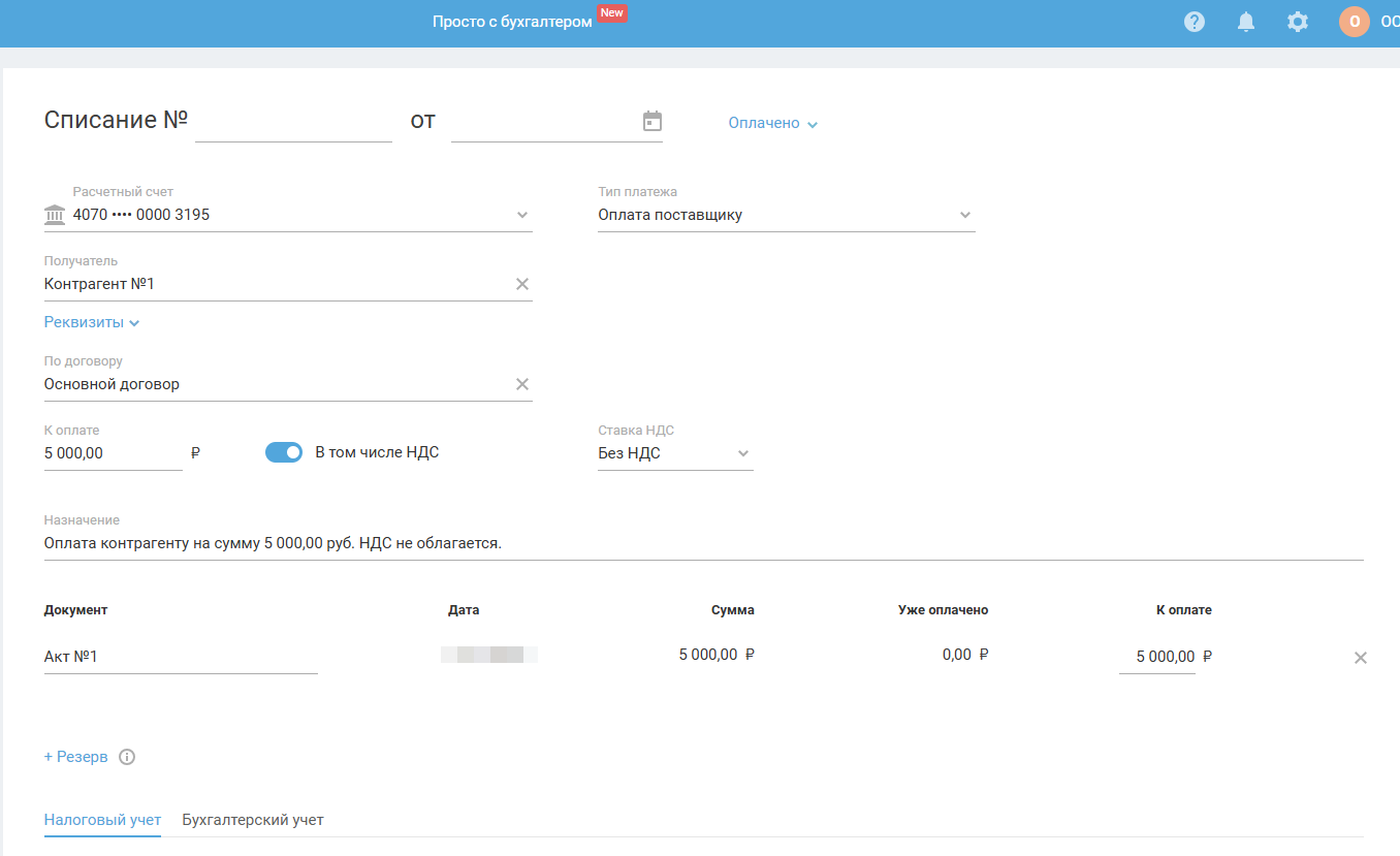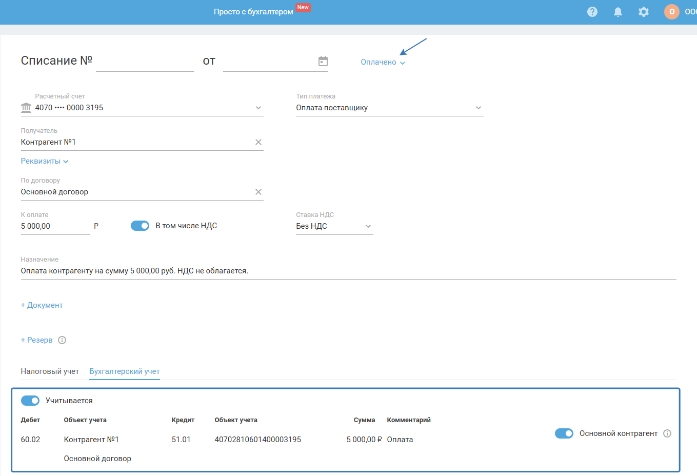 3) Оплату отразите в разделе «Деньги — Банк» как списание с Типом платежа «Оплата поставщику», укажите Основной договор, получателя — наименование контрагента и сумму. Если статус п/п «Оплачено», то автоматически будет создана проводка: Дт 60.02 (поставщик, основной договор) Кт 51.01 на сумму оплаты в магазине: