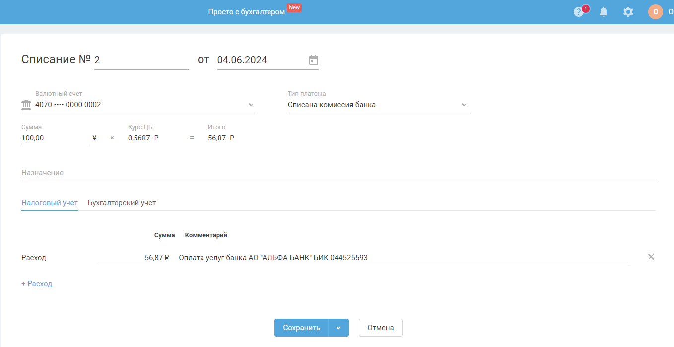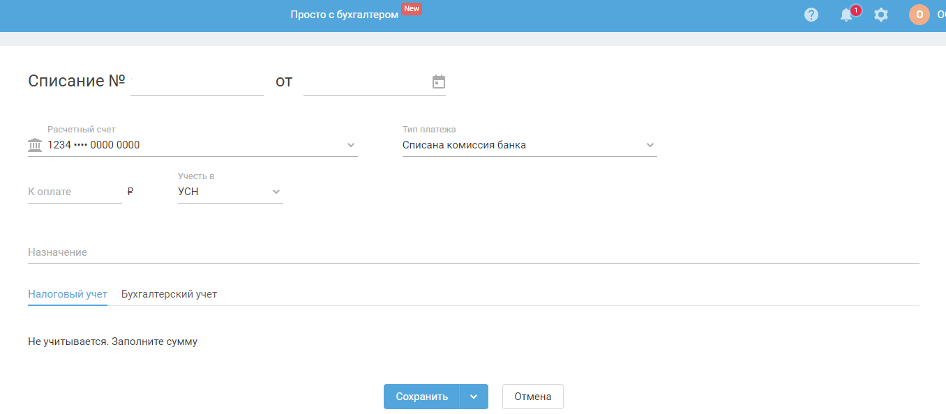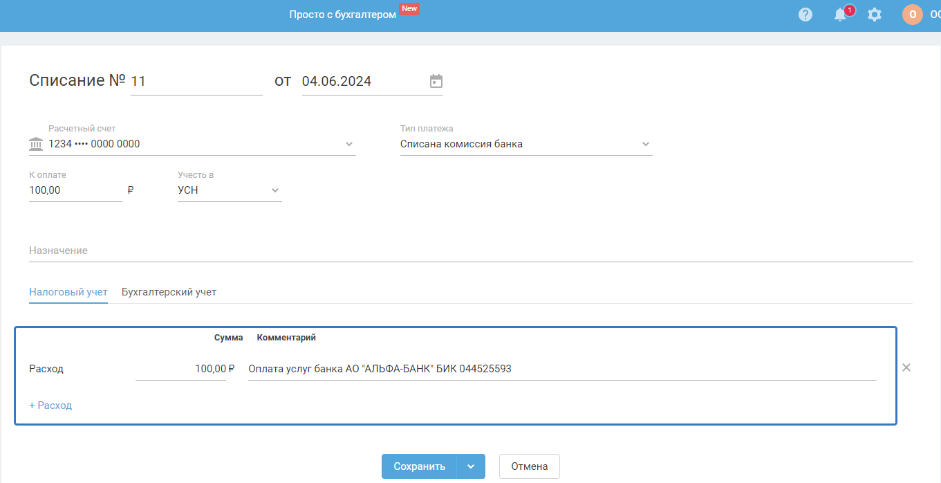 Списание с типом Комиссия банка создается в автоматическом режиме при загрузке банковской выписки. Используйте данную инструкцию для добавления данной операции в ручном режиме (самостоятельно).