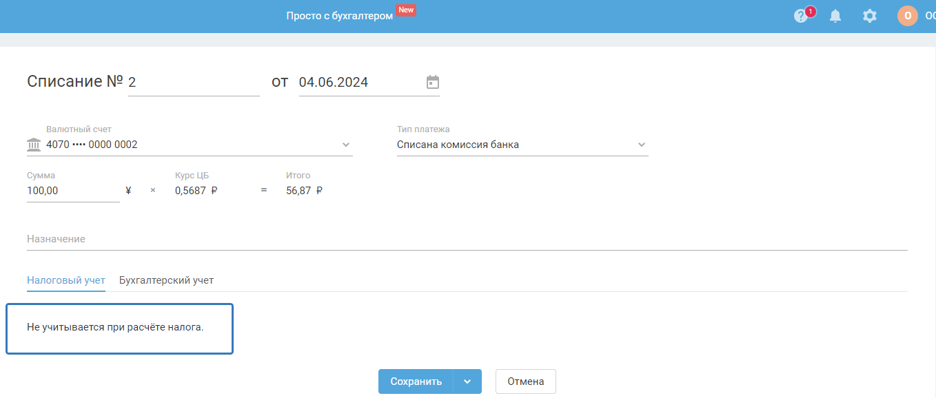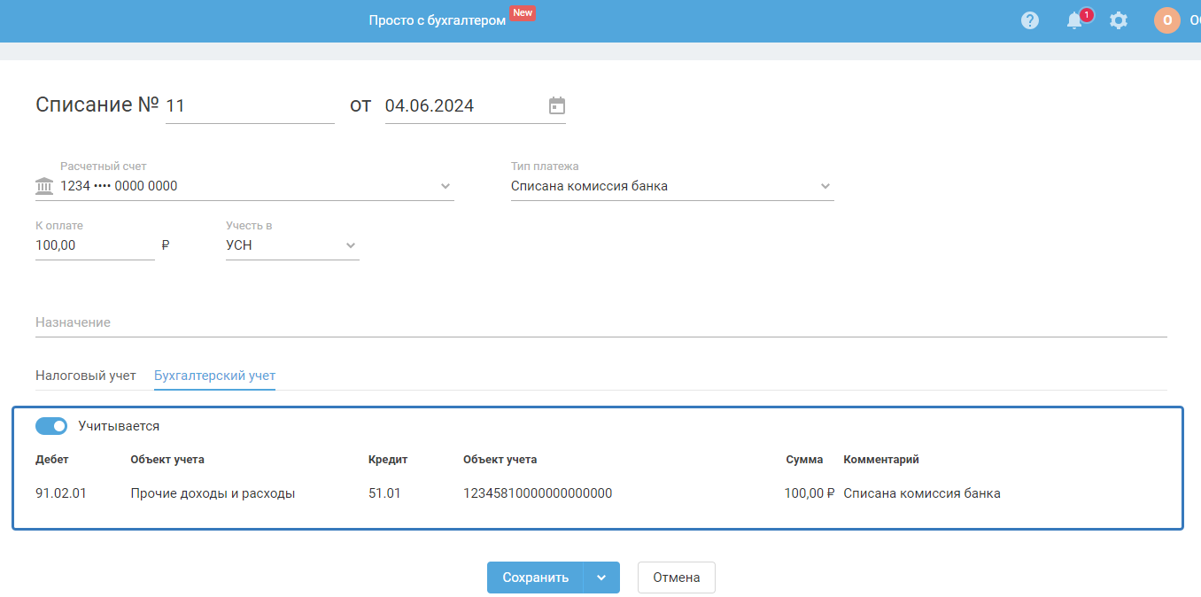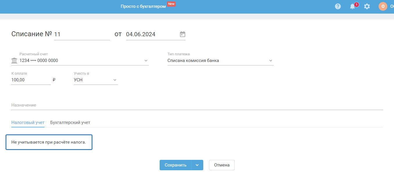 2) На УСН доходы — когда в «Учётной политике» в качестве объекта налогообложения выбран «доходы», списание с типом «комиссия банка» не признаётся расходом: