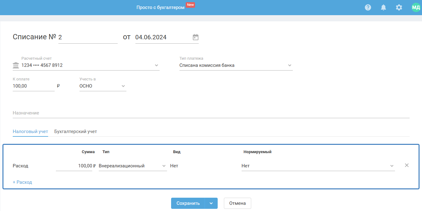 3) На ОСНО комиссия банка признаётся внереализационном расходом. При необходимости отредактируйте значение в графе «Сумма».
