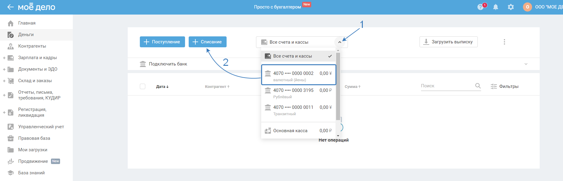 В разделе «Деньги» нажмите «Все счета и кассы» и выберите из выпадающего списка расчётный рублёвый счёт, с которого происходит списание денежных средств: