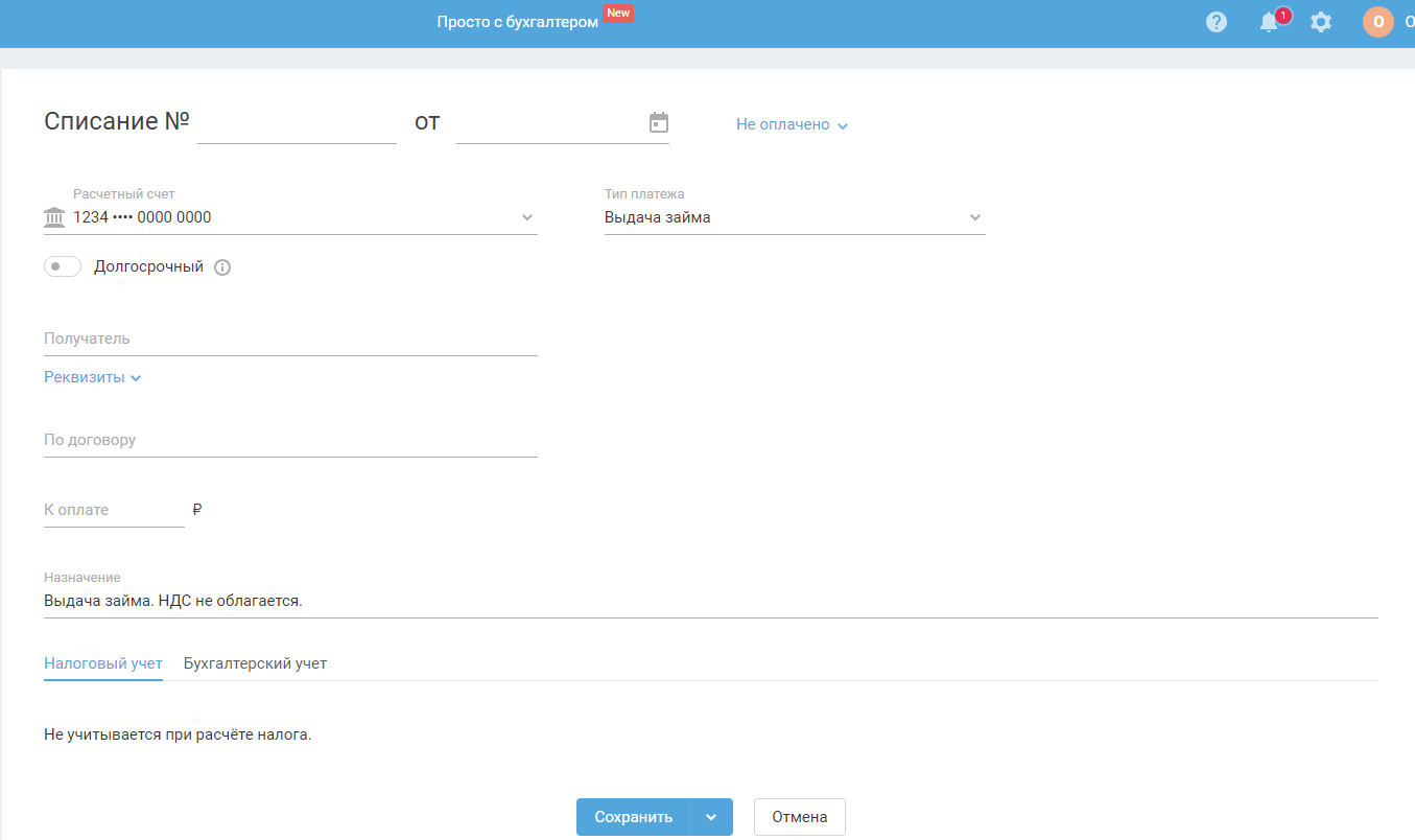 В разделе «Деньги» выберите р/сч и создайте списание с типом «Выдача займа». В открывшемся окне заполните данные: