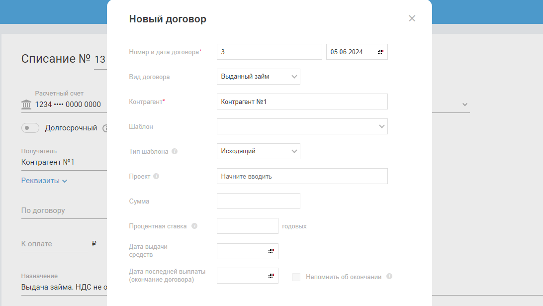 — В строке «Долгосрочный» — настройка выделяется в случае, если по договору займ предоставлен более чем на 12 месяцев.