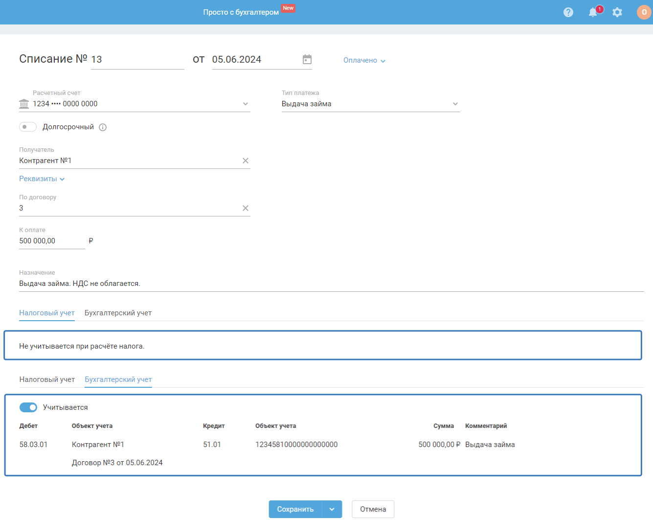 Опция «Учитывается» в блоке «Бухгалтерский учёт» позволяет отменять учёт созданного списания в бухгалтерском учёте. В такой ситуации операция будет отображена в сервисе, однако проводки бухгалтерского учёта по ней сформированы не будут. Рекомендуем с осторожностью подходить к использованию данной опции, так как могут быть искажены данные бух. учёта.