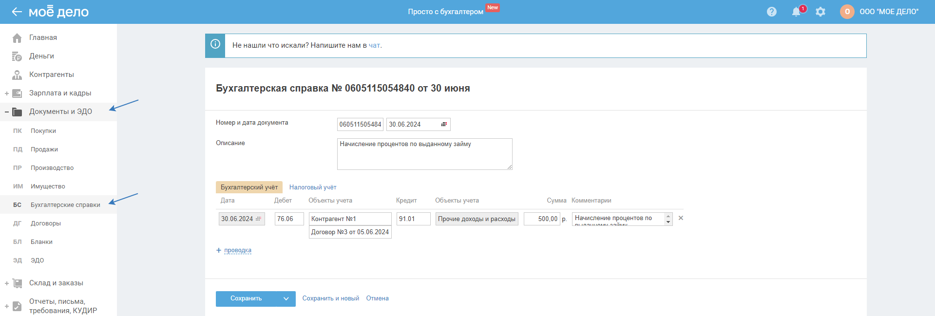 Для ООО после закрытия месяца автоматически создаётся бух. справка по начислению процентов по выданному займу Дт 76.06 — Кр 91.01.