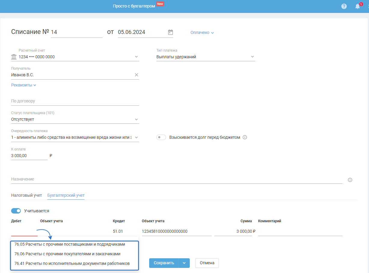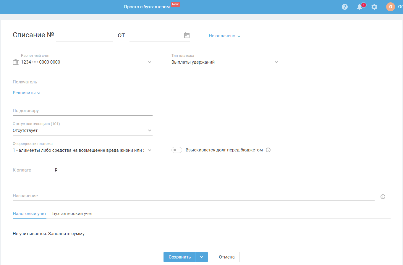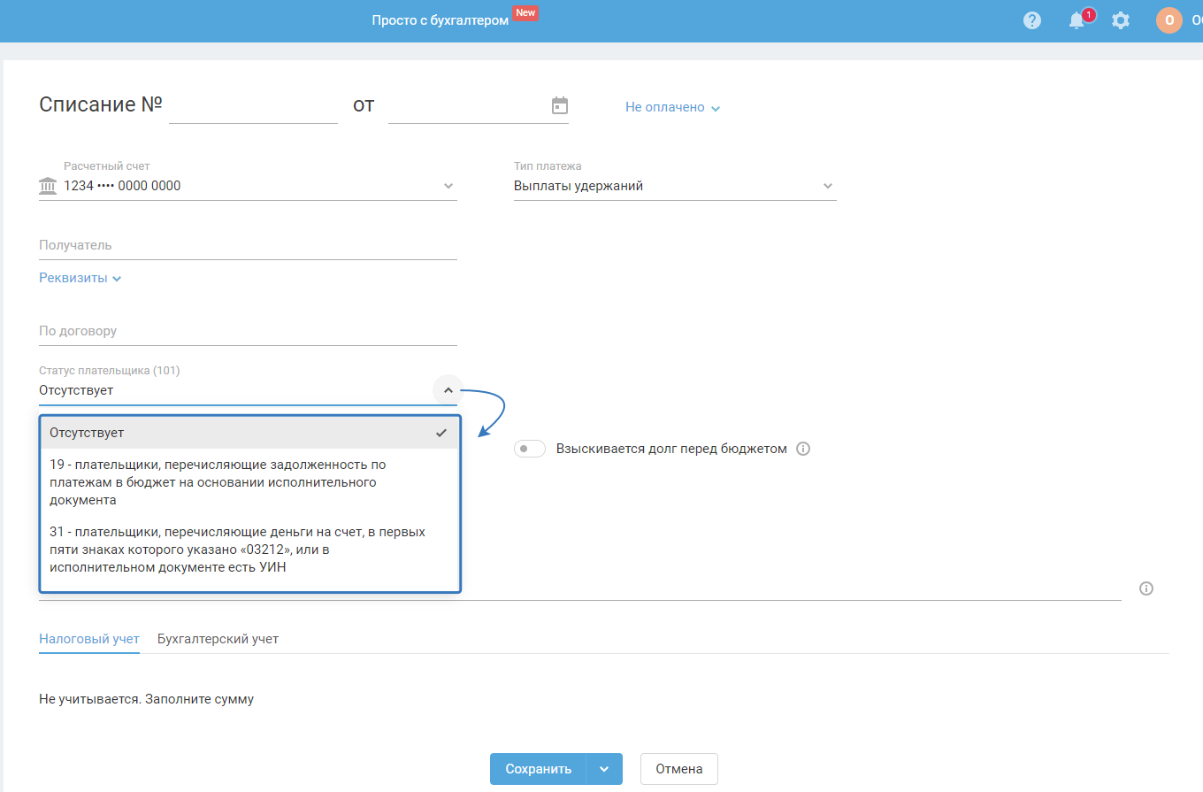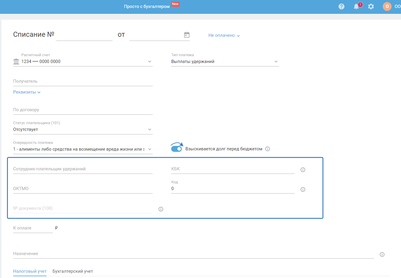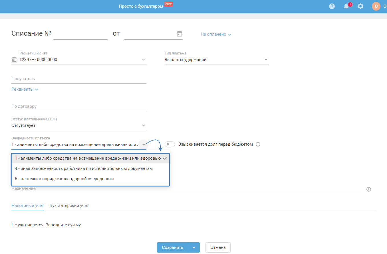 — Выплаты удержаний осуществляются с расчётного счёта. В соответствующем поле выберите номер р/сч, который добавлен в разделе «Реквизиты» → «Расчётные счета».