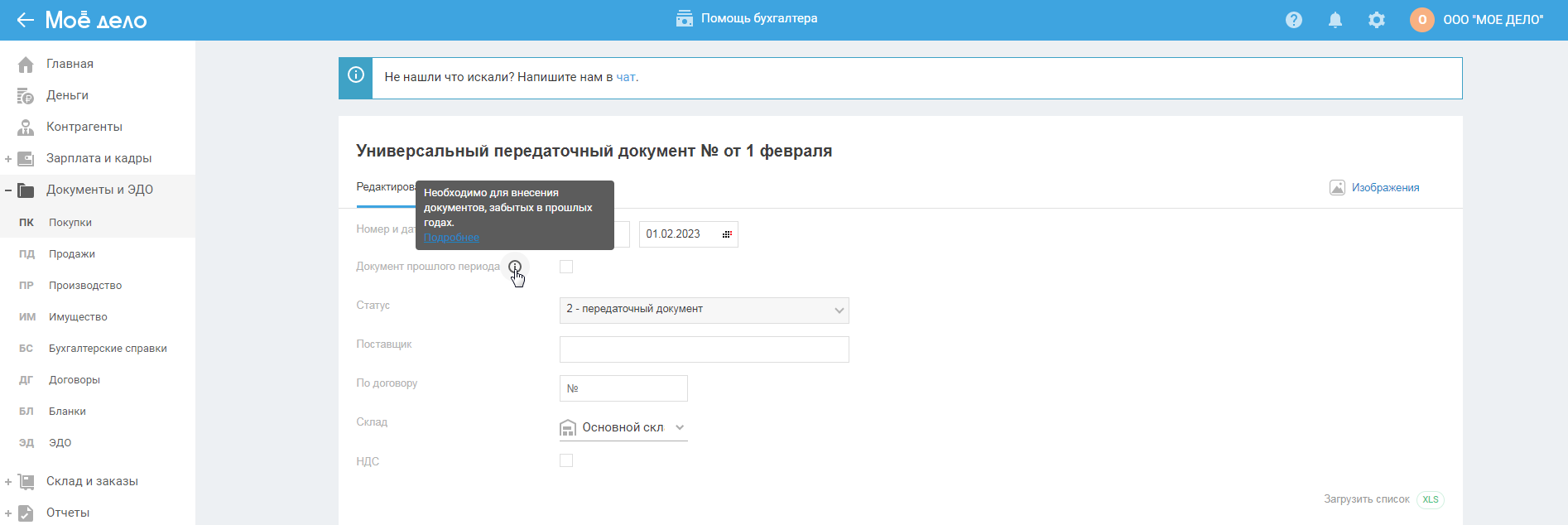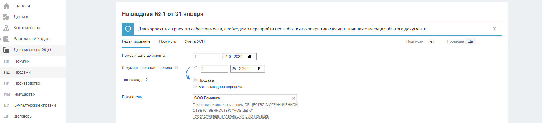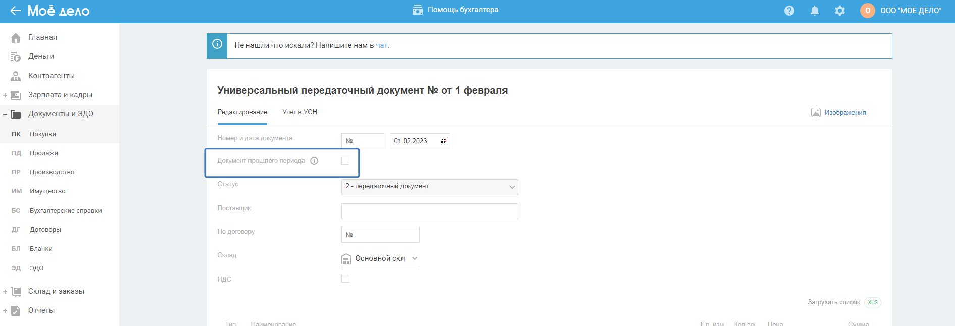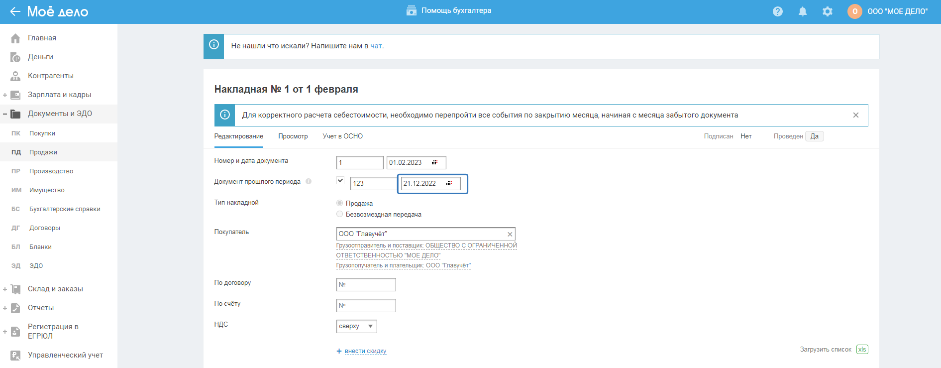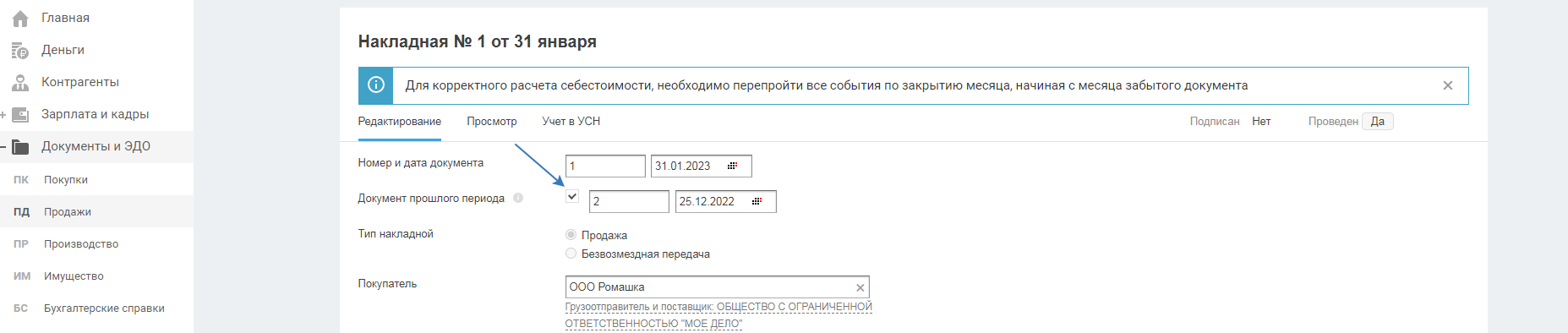 Включить опцию «Документ прошлого периода» Вы можете в следующих документах на покупку (накладная, УПД, обычный счет-фактура) и продажу (накладная, УПД, обычный счет-фактура). Для этого перейдите в окно создания документа и в режиме «Заполнение» поставьте галку в строке «Документ прошлого периода».
