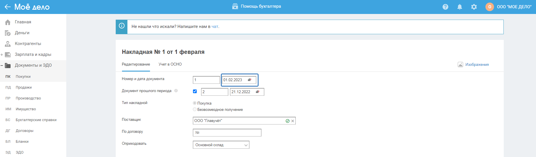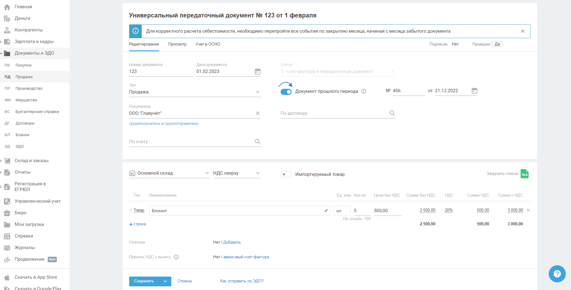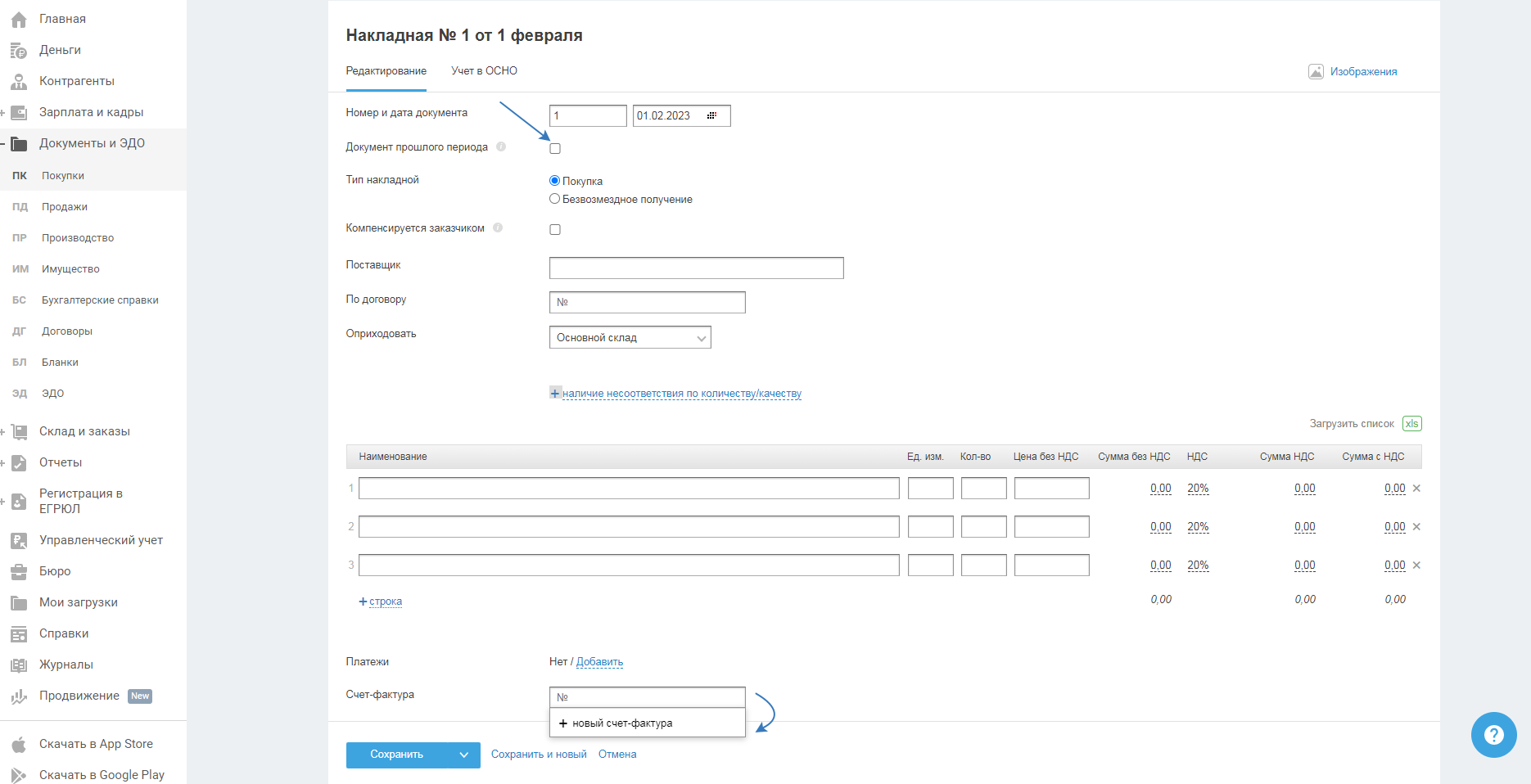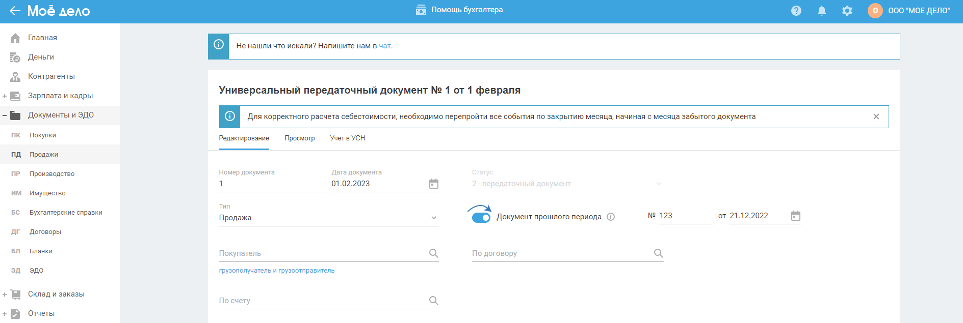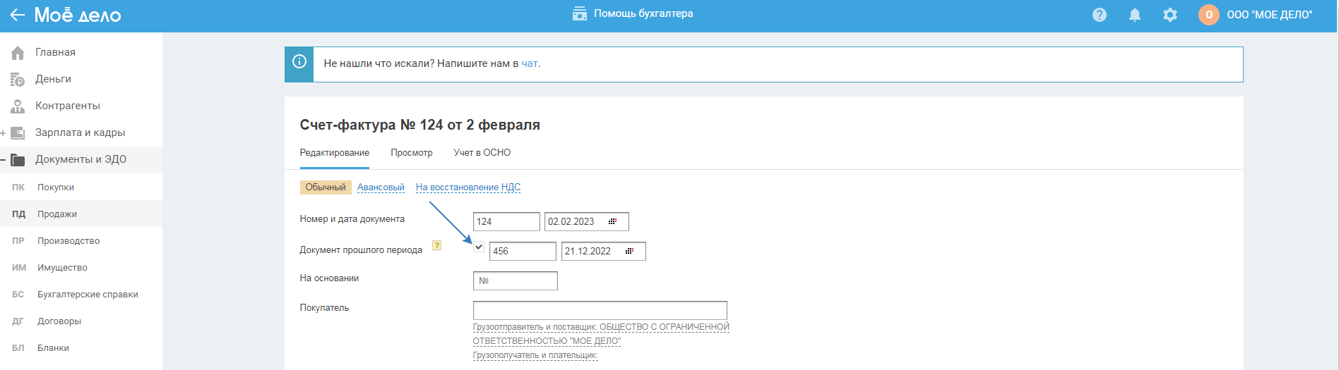 Включить опцию «Документ прошлого периода» Вы можете в следующих документах на покупку (накладная, УПД, обычный счет-фактура) и продажу (накладная, УПД, обычный счет-фактура). Для этого перейдите в окно создания документа и в режиме «Заполнение» поставьте галку в строке «Документ прошлого периода».