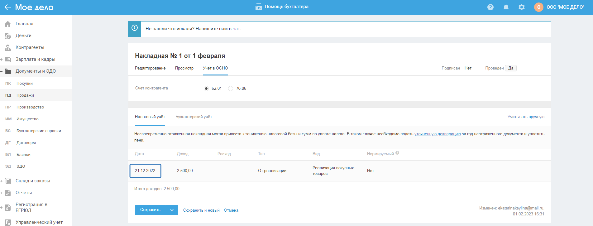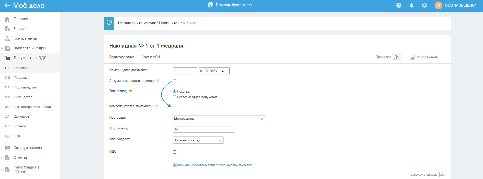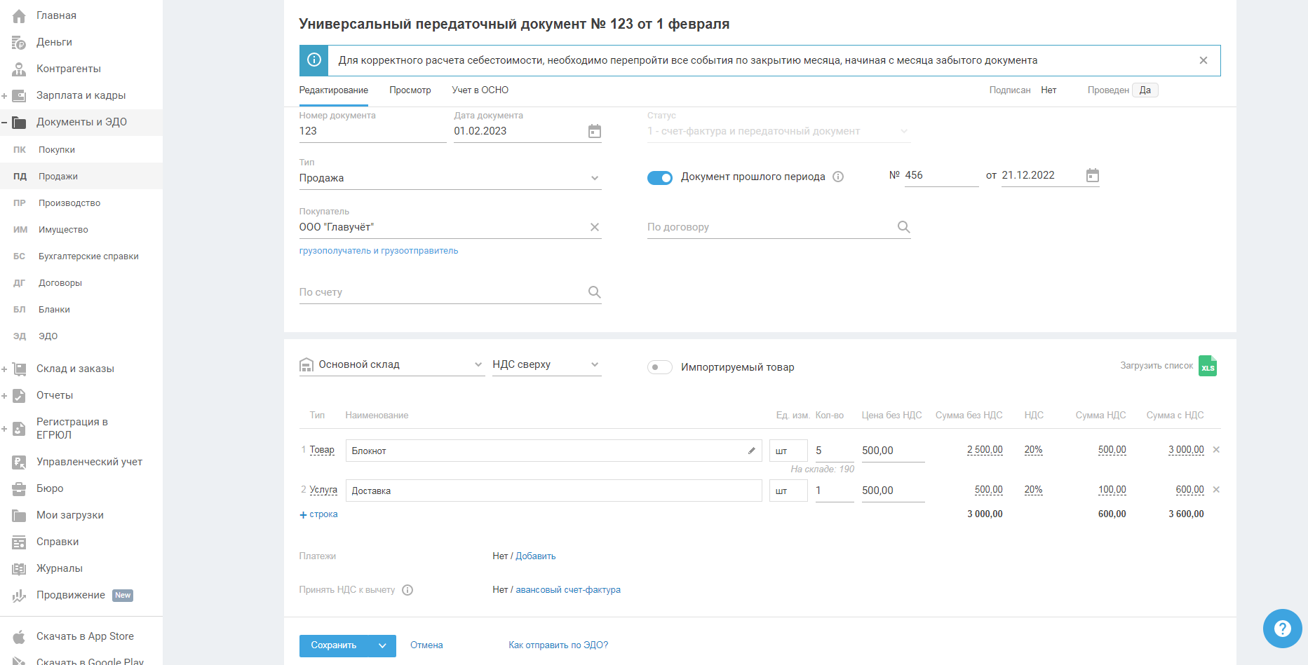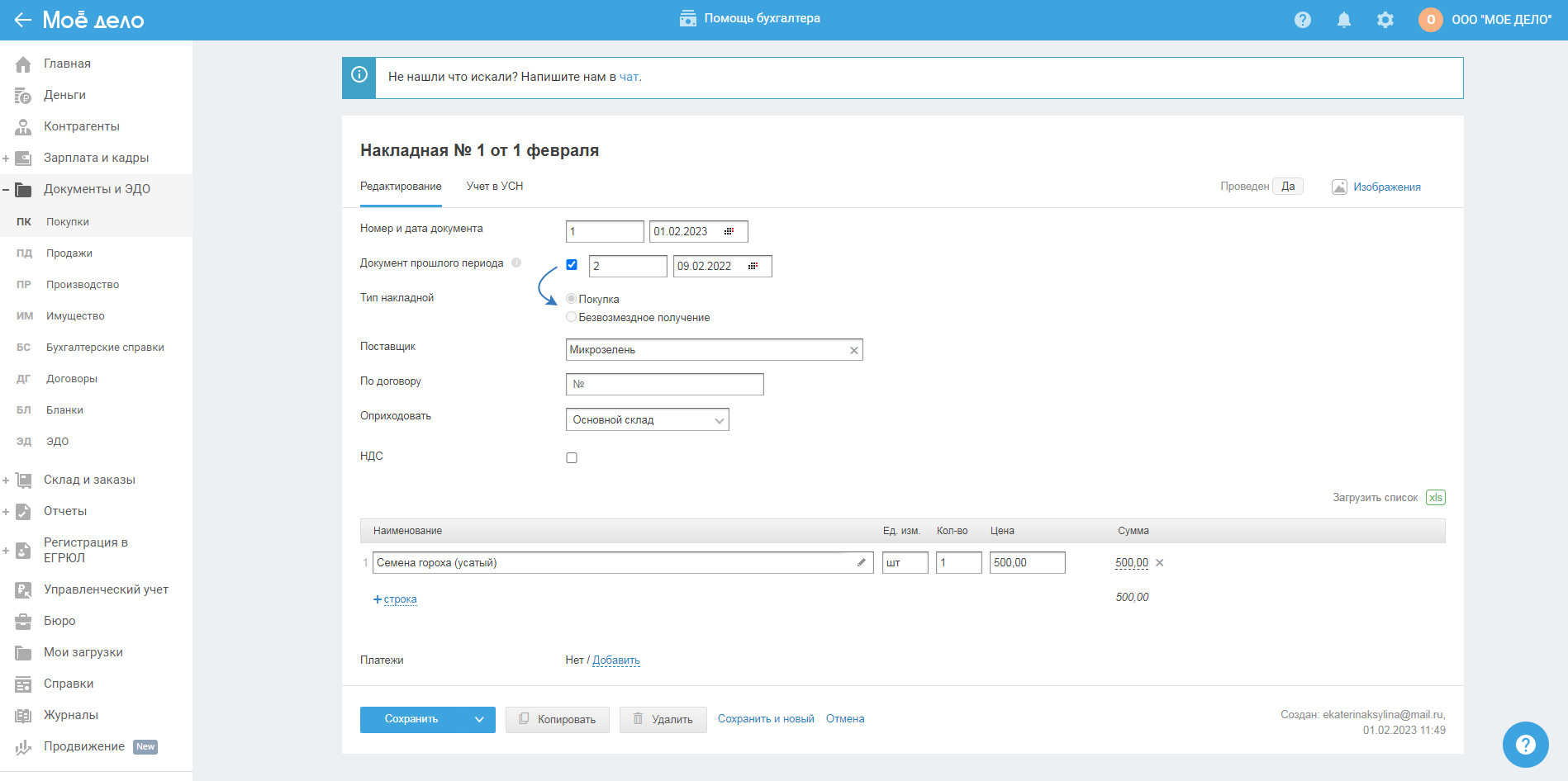 Включить опцию «Документ прошлого периода» Вы можете в следующих документах на покупку (накладная, УПД, обычный счет-фактура) и продажу (накладная, УПД, обычный счет-фактура). Для этого перейдите в окно создания документа и в режиме «Заполнение» поставьте галку в строке «Документ прошлого периода».