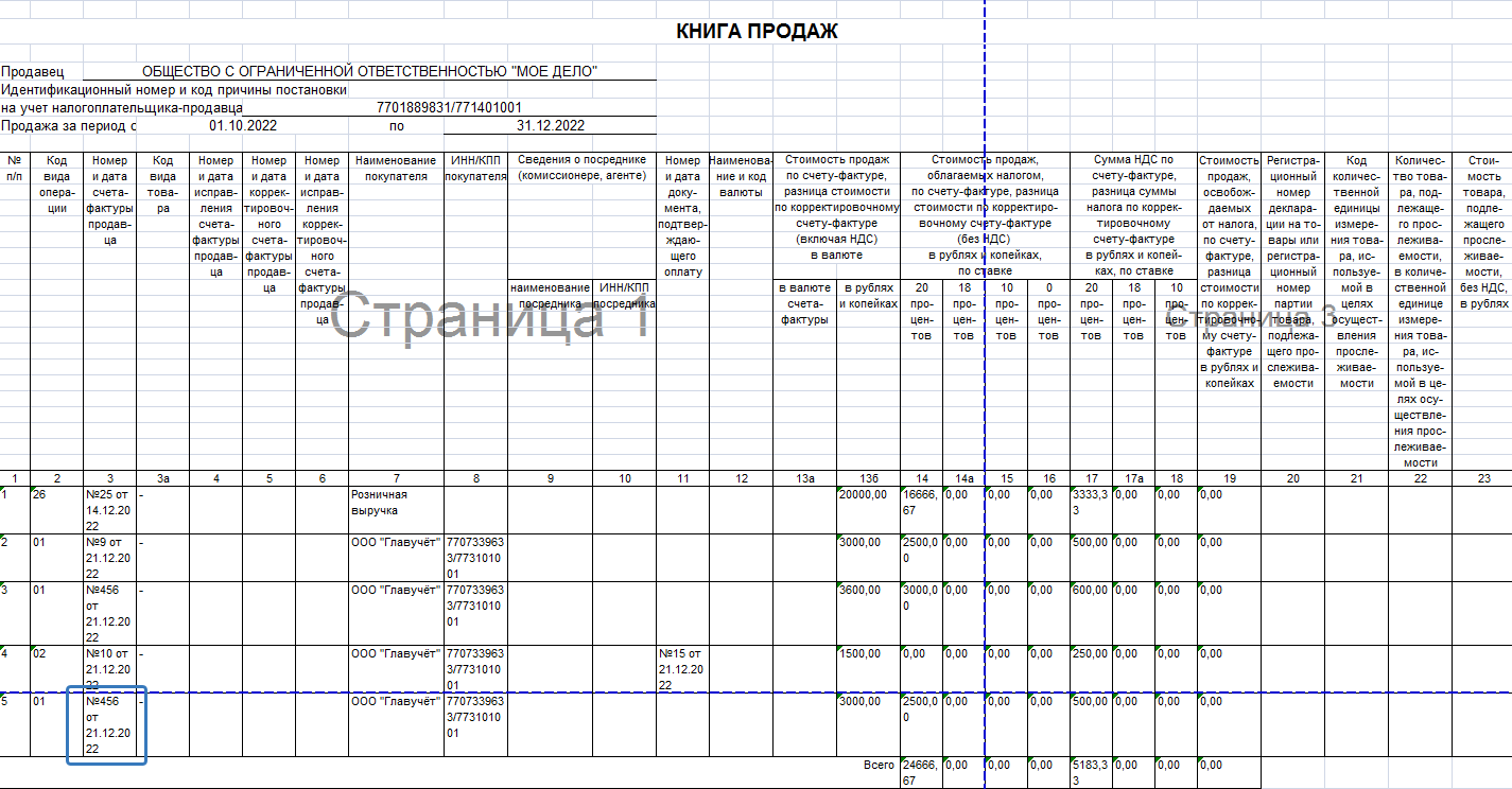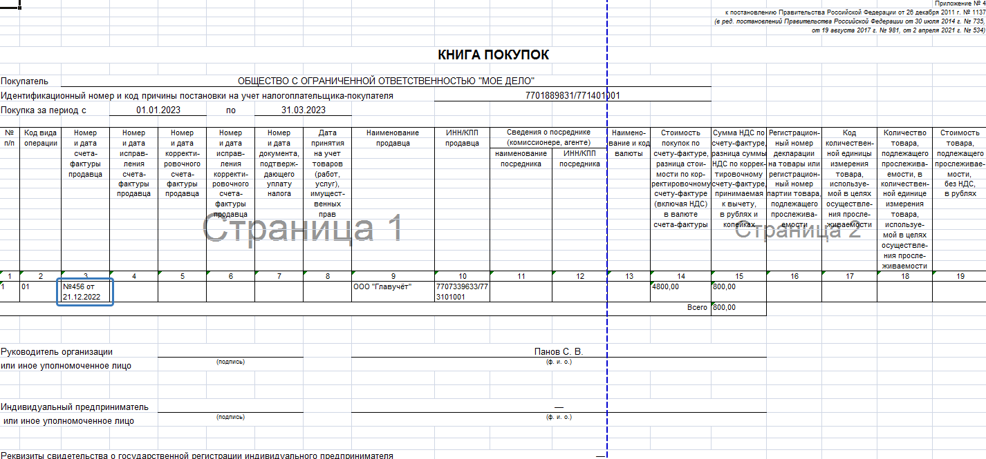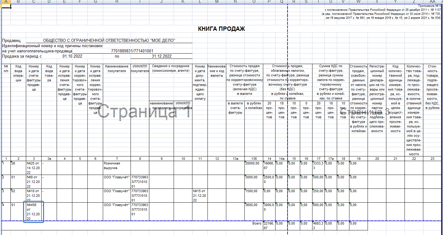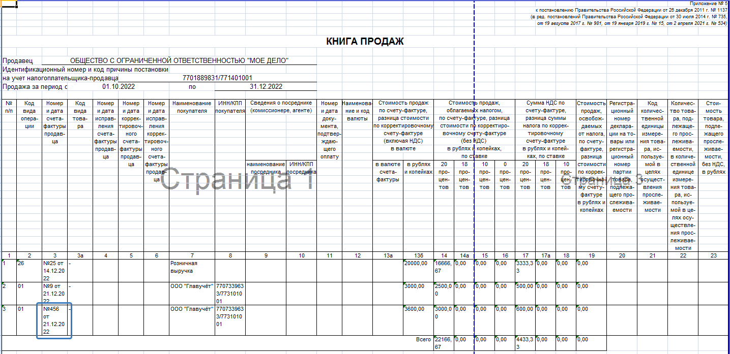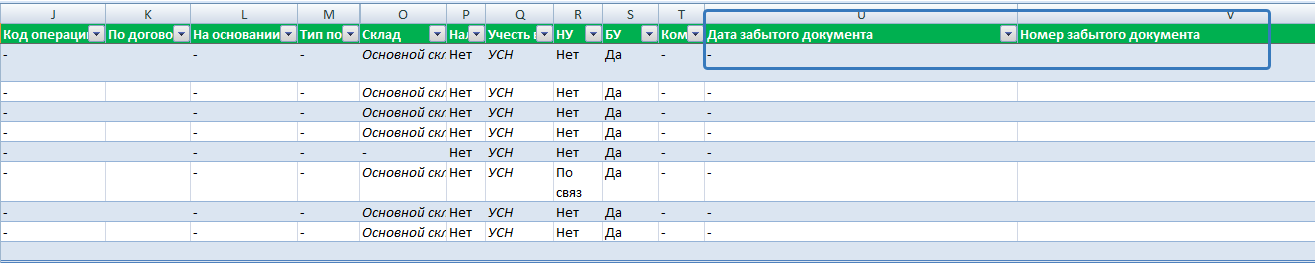По всем созданным документам при скачивании реестра, содержащего документы прошлого периода, появляются графы «Дата забытого документа» и «Номер забытого документа».
