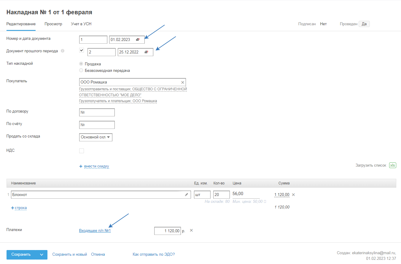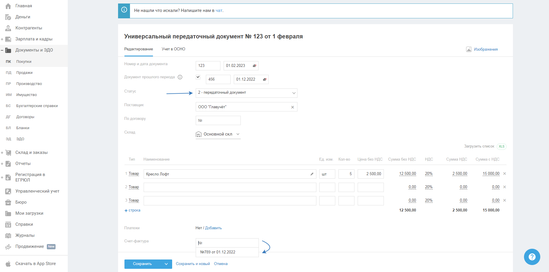 В окне создания / редактирования УПД поставьте галку в строке «Документ прошлого периода» и укажите номер и дату документа.
