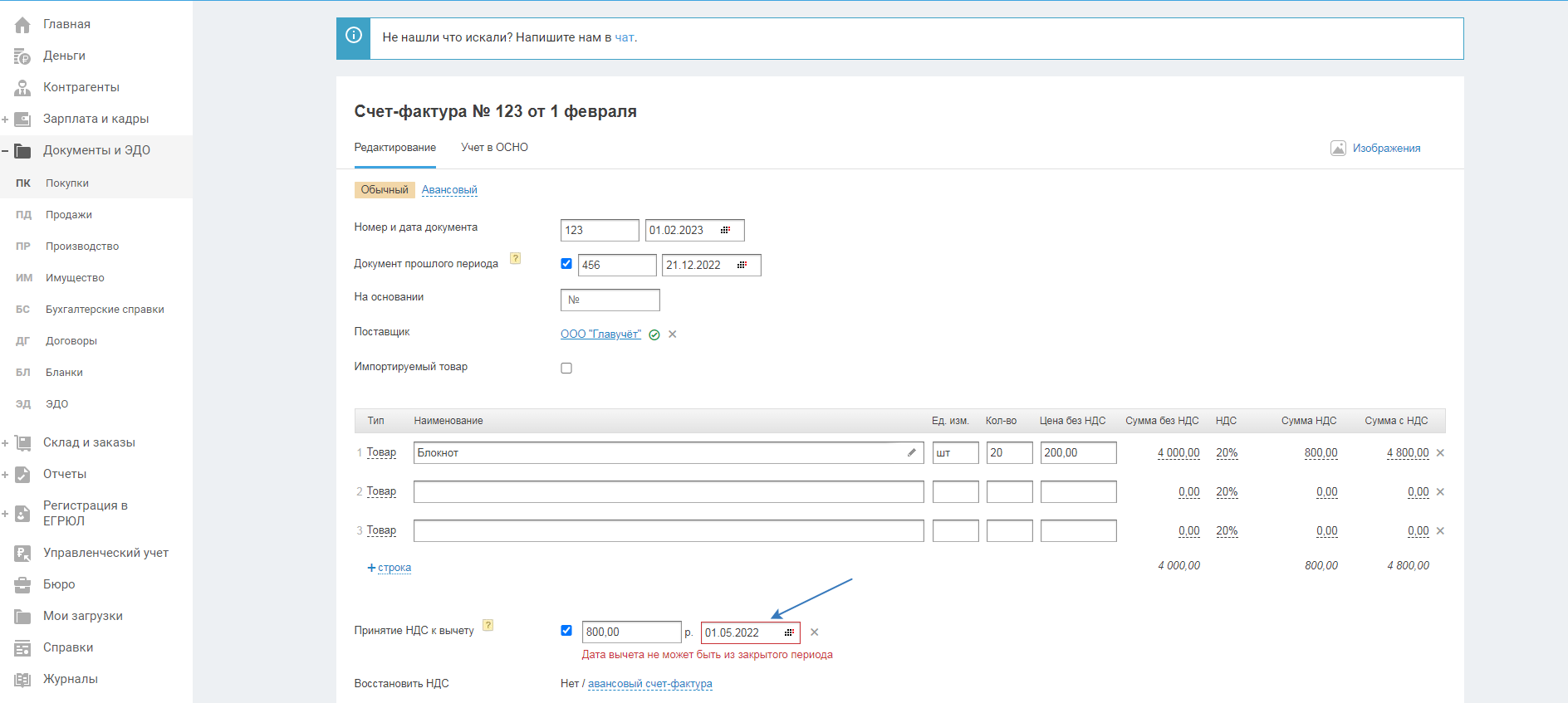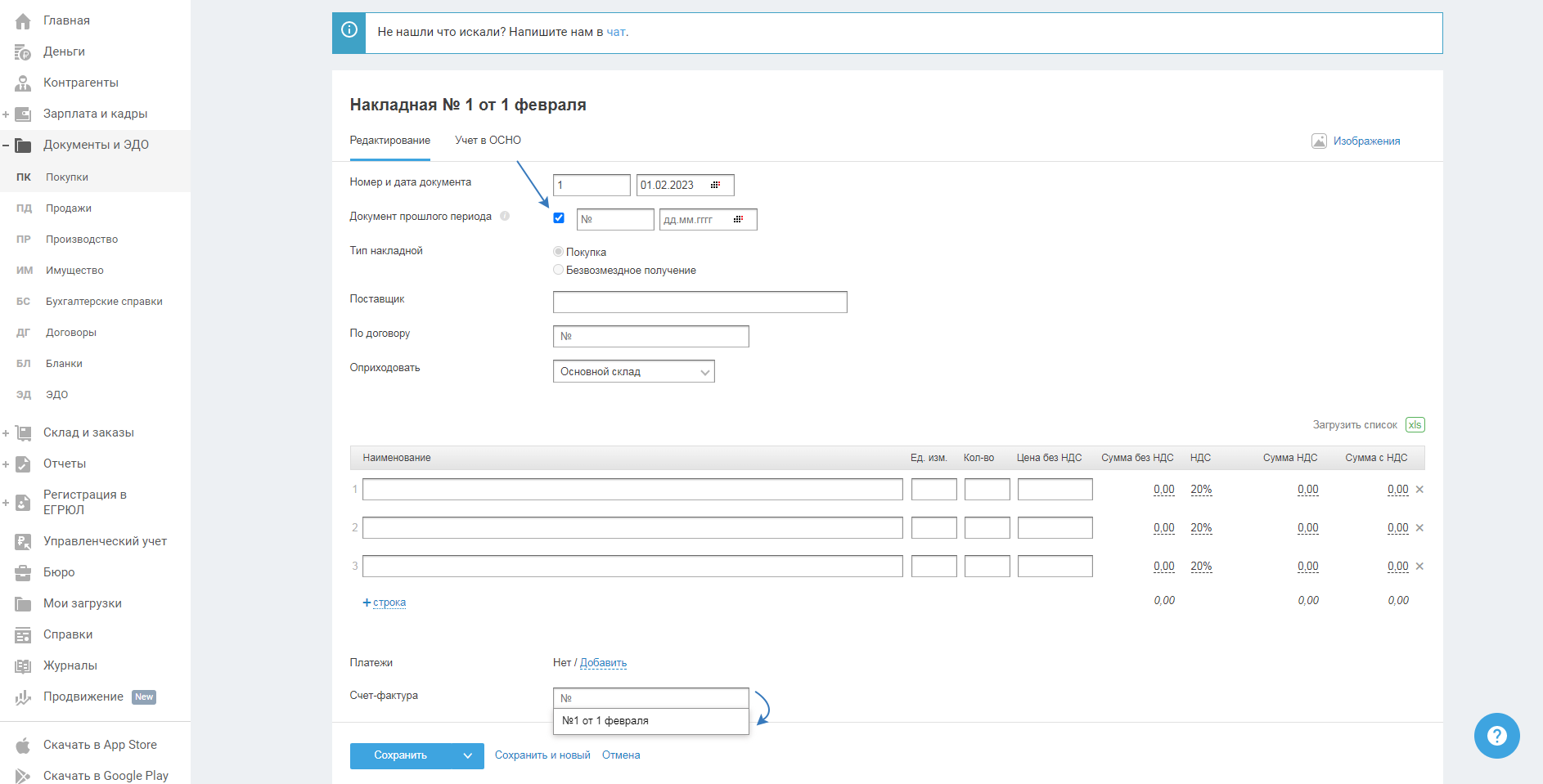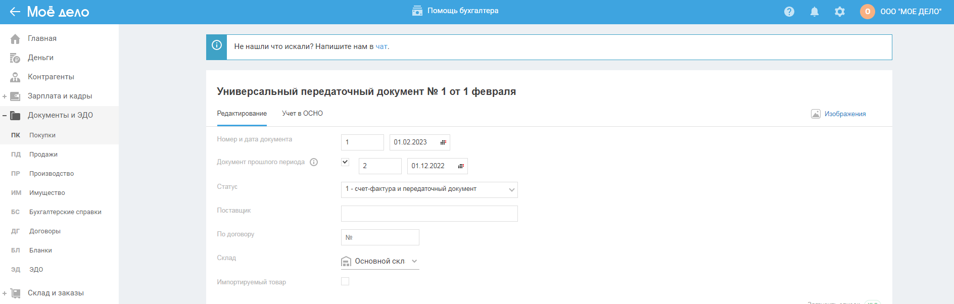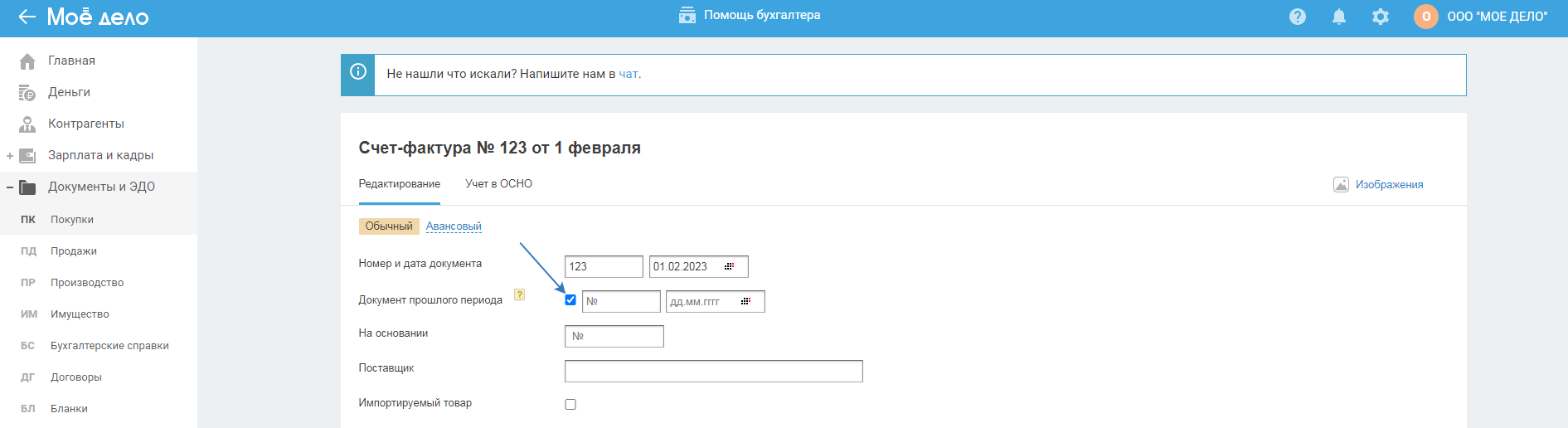 - в строке «счет-фактура» (на тарифах ОСНО) нет возможности создать новый счет-фактура, при этом, для выбора будет доступен счет-фактура созданный в сервисе в разделе «Документы и ЭДО - Покупки».