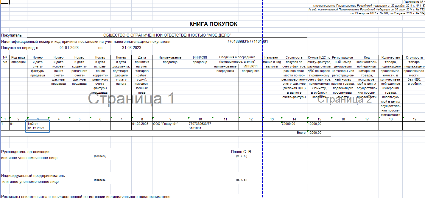 в декларации по НДС и книге покупок НДС будет учитываться датой принятия к вычету и с реквизитам (дата и номер) документа прошлого периода. В примере ниже не заполнена графа 8 - дата принятия на учет, т.к. счет-фактура не связан с передаточным документом - актом, накладной, УПД со статусом 2, для принятия НДС к вычету имущество(работы, услуги) должны быть приняты на учет;