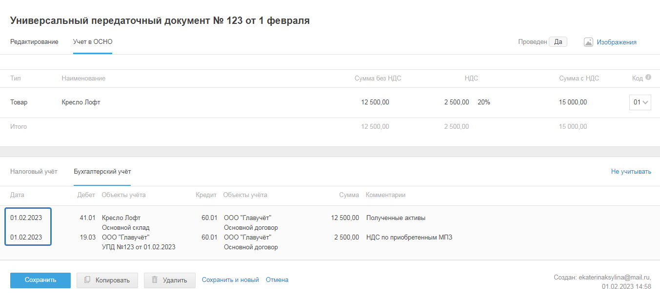 В бухгалтерском учёте записи формируются датой документа (в режиме «Заполнение» строка «Номер и дата документа»), проводки такие так в УПД на покупку,