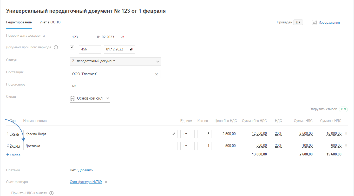 В окне создания / редактирования УПД передвиньте переключатель в строке «Документ прошлого периода» и укажите номер и дату документа (см. общая информация).