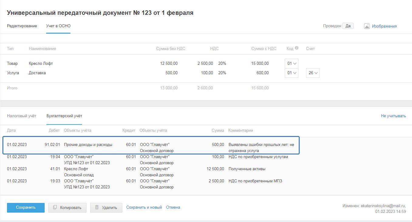 только по услугам формируется запись по счету 91.02 (в случае с документом текущего периода Дт 26.01) и в комментарии указывается что это «Выявлены ошибки прошлых лет: не отражена услуга».