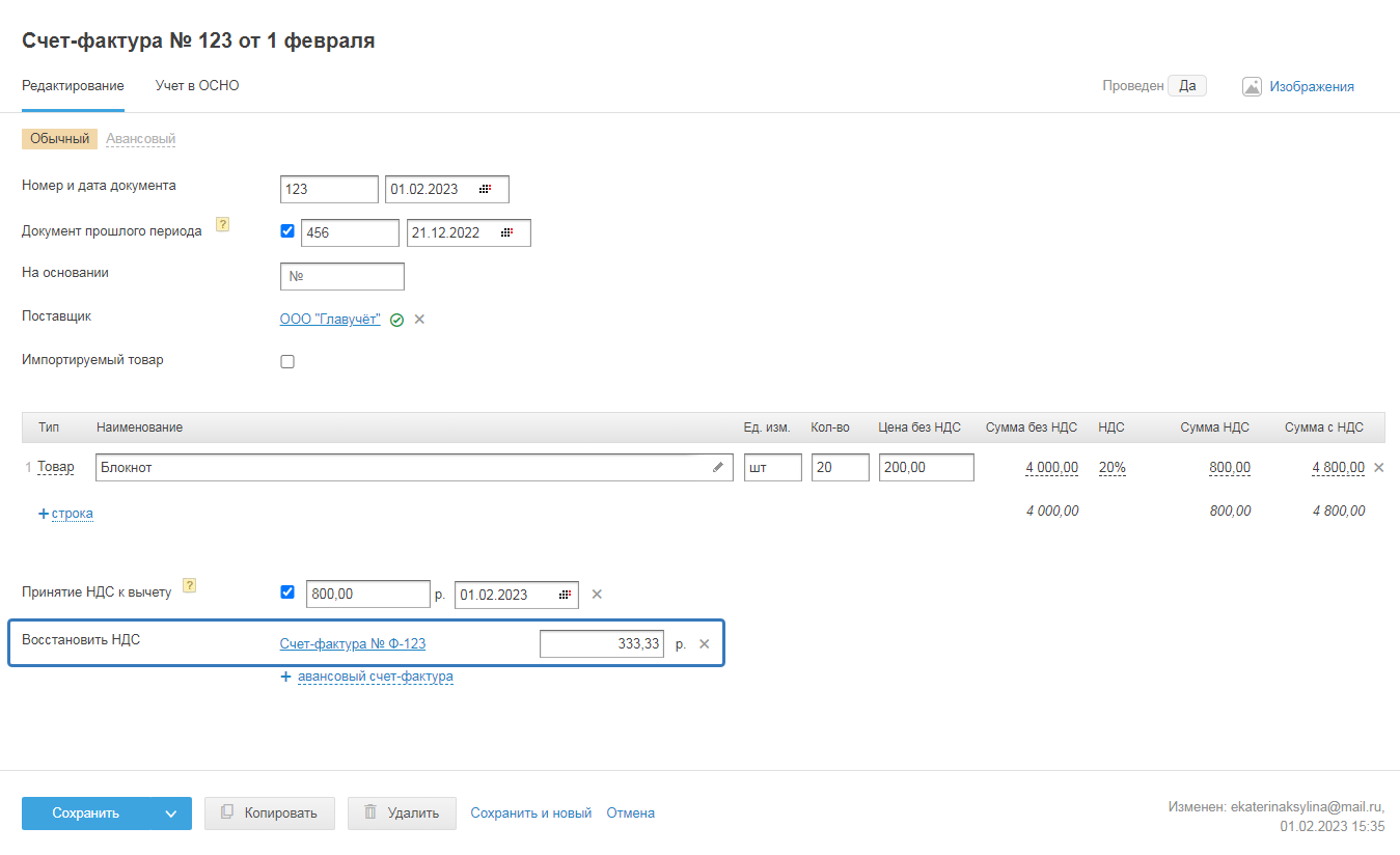 - при восстановлении НДС по авансовому счёту-фактуре, формируется запись в декларации по НДС и книге продаж в квартале документа прошлого периода.