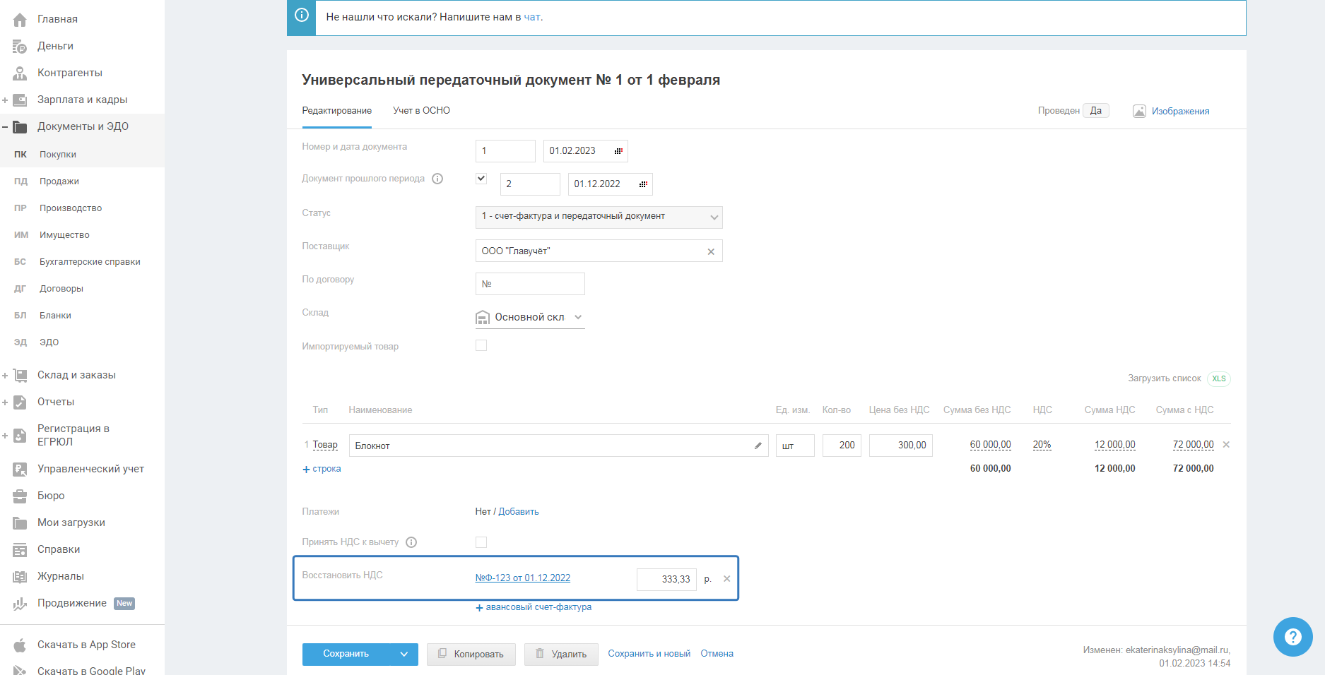 При восстановлении НДС по авансовому счёту-фактуре измениться налоговая база по НДС в том отчетном периоде(квартале), к которому относится дата, указанная в строке «Документ прошлого периода». Сформируйте декларацию по НДС за этот период и сравните с ранее отправленной, при необходимости, направьте корректировку.