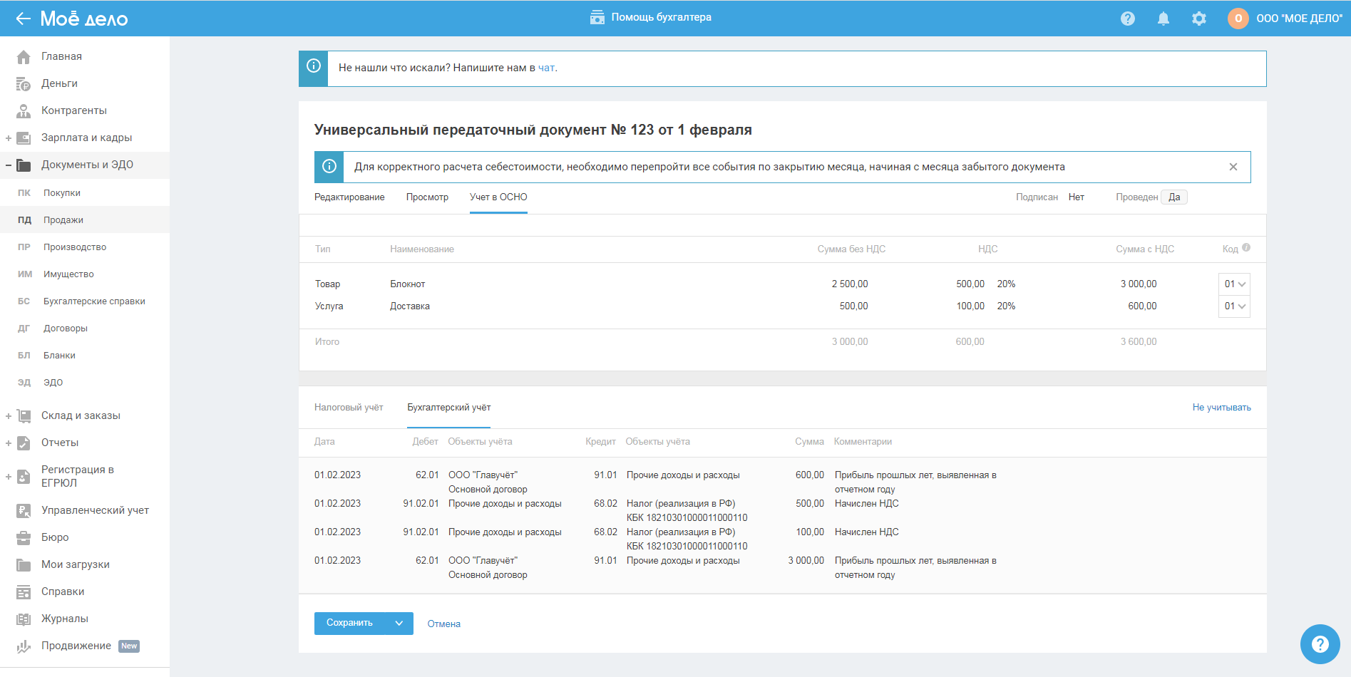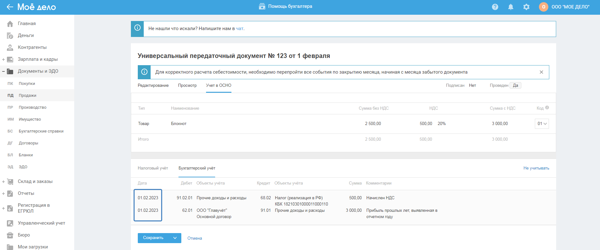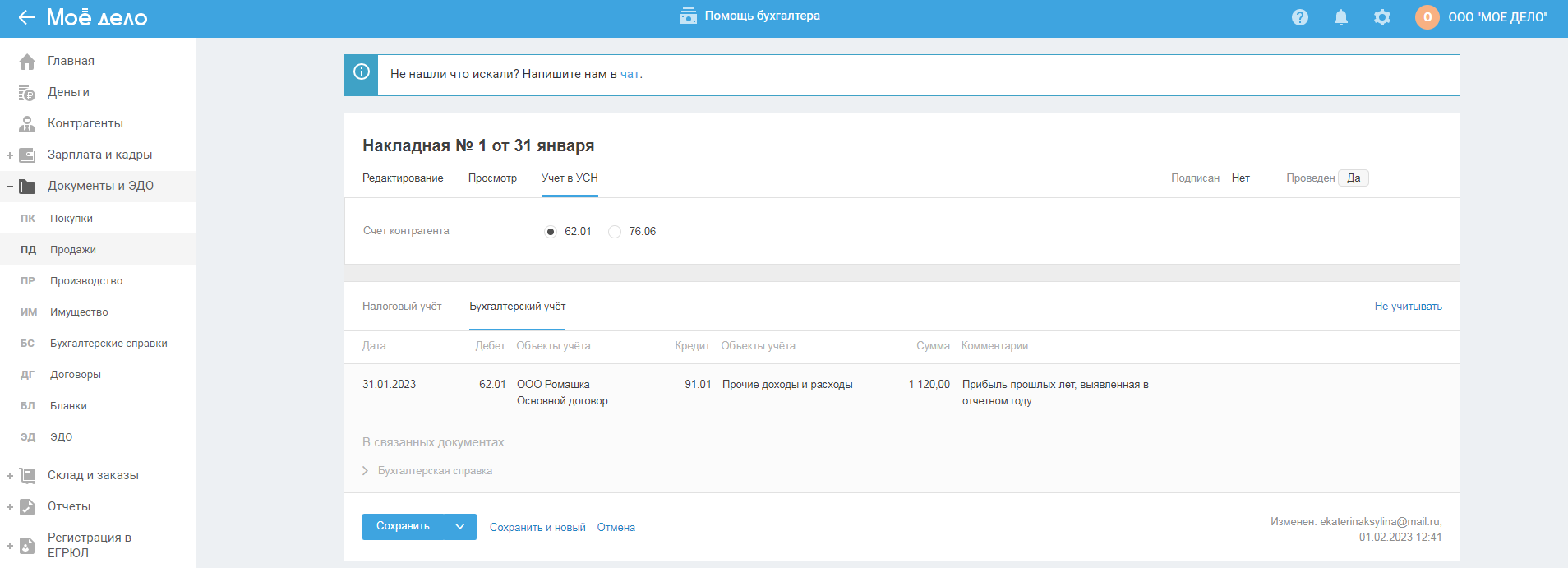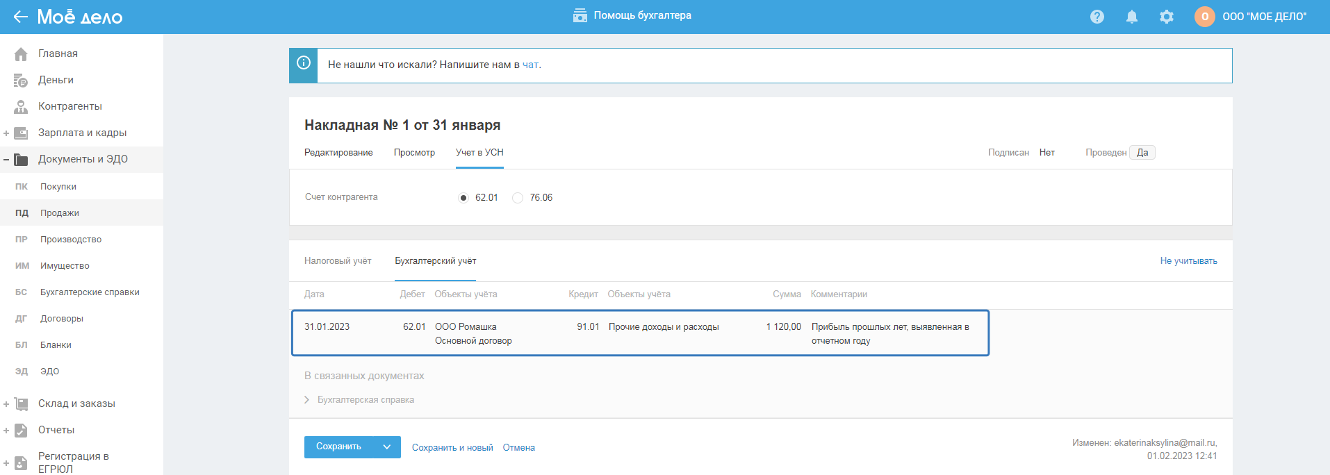 В бухгалтерском учёте операции по реализации товаров / материалов / услуг отражаются проводками Дт 62 или 76 (в зависимости от значения выбранного в строке «счет контрагента») Кт 91.01 и в комментарии указывается что это «прибыль прошлых лет, выявленная в отчетном году».