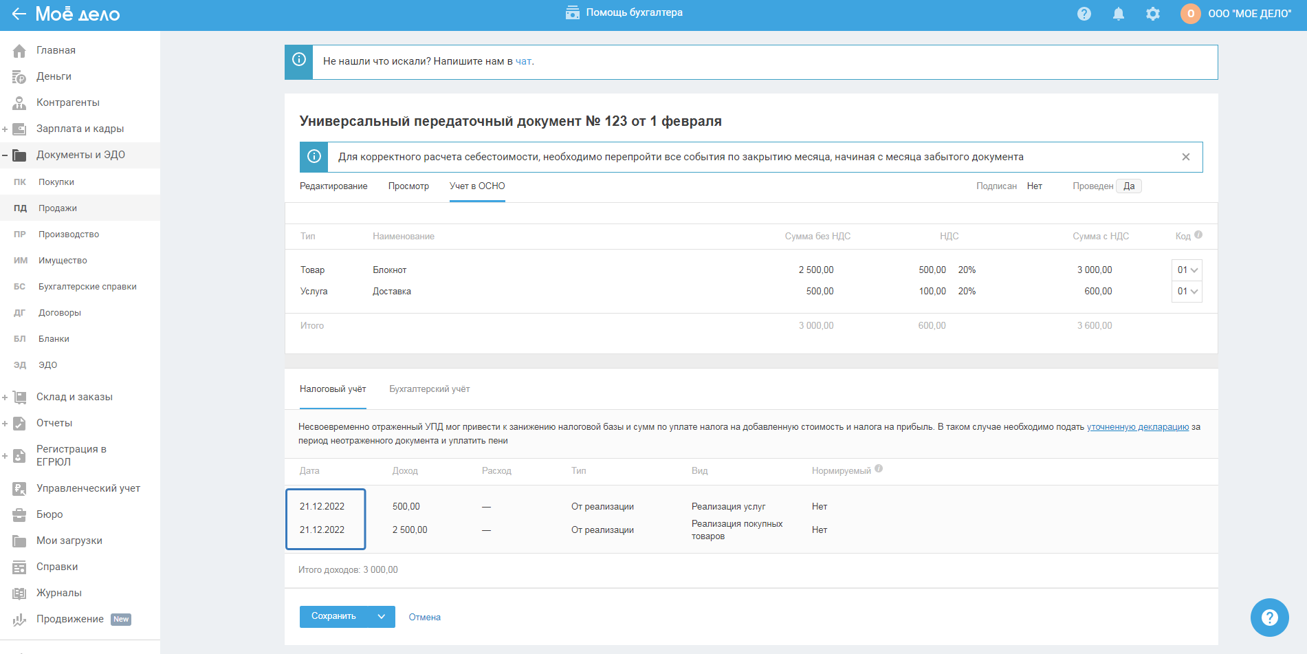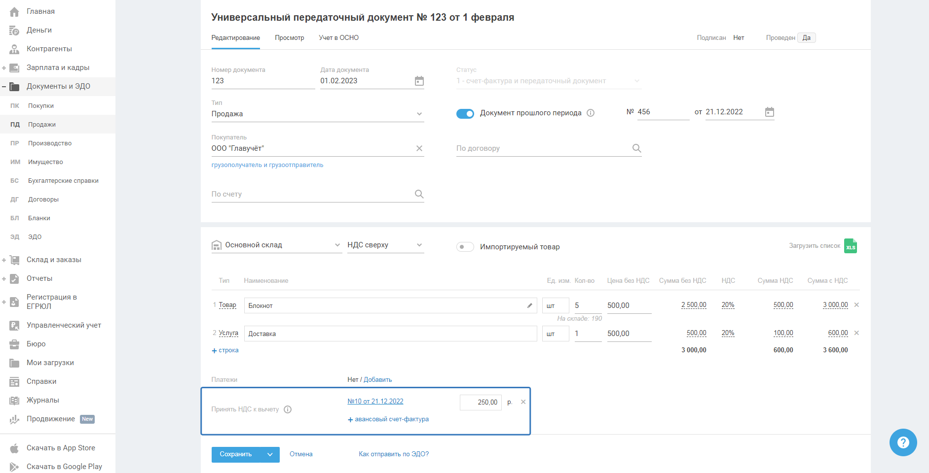 Заполнение остальных полей аналогично как в УПД на покупку, при этом на тарифах ОСНО и статусе УПД 1: