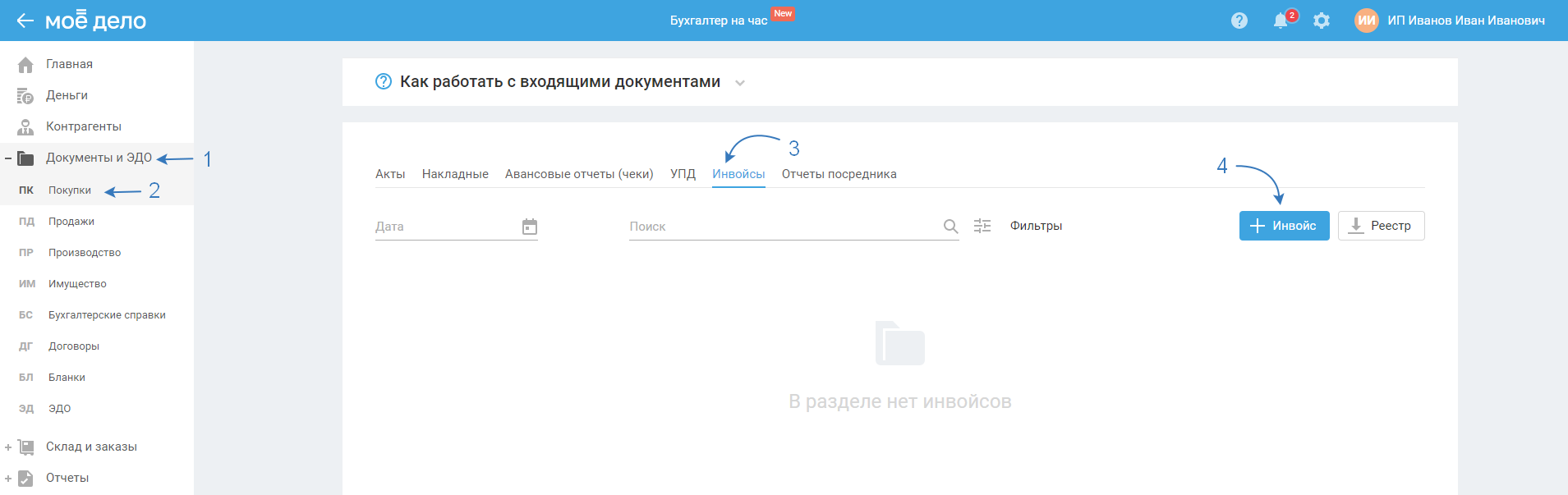 Для создания инвойса пройдите в раздел «Документы и ЭДО - Покупки - Инвойсы» , нажмите «+ Инвойс» .