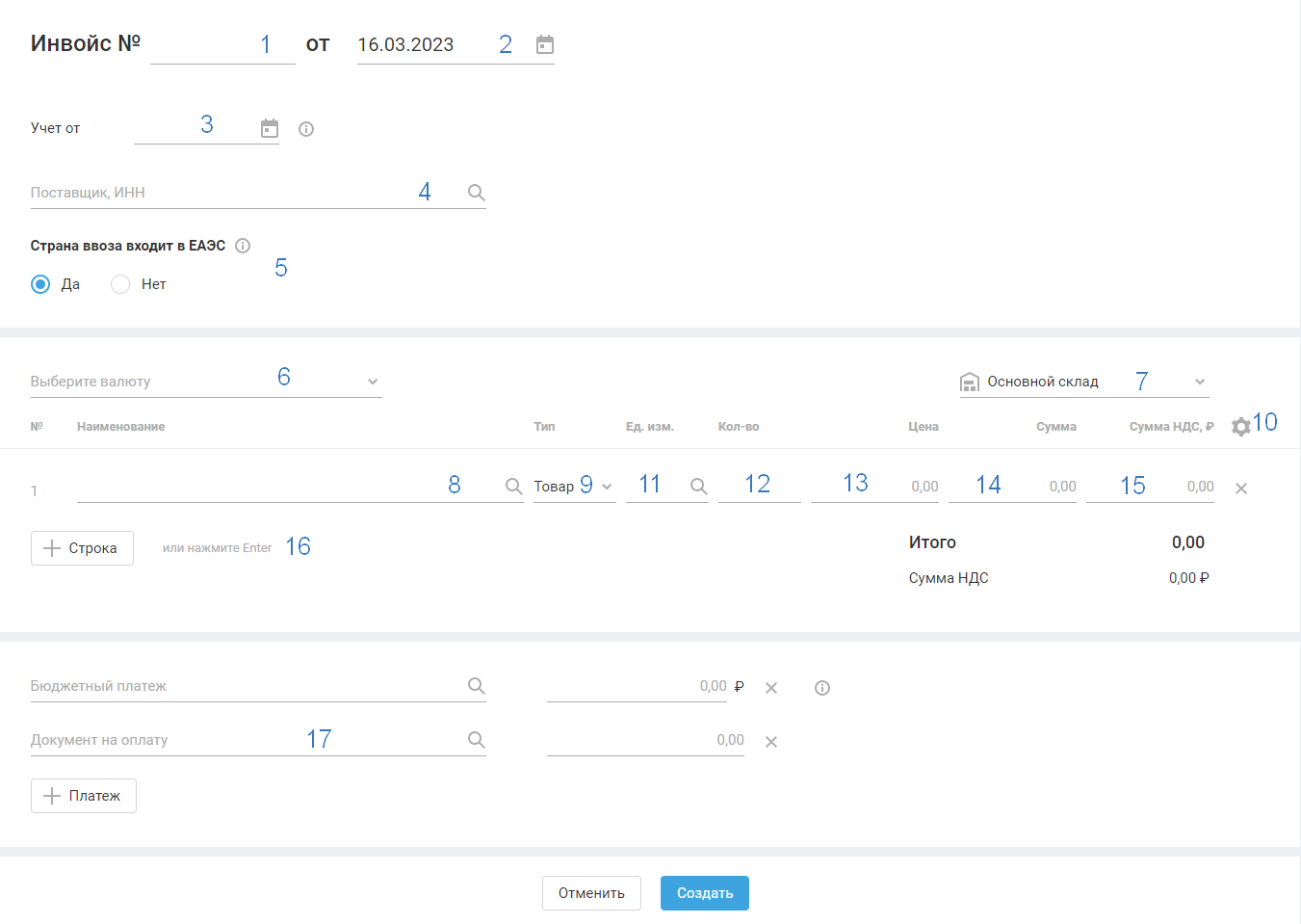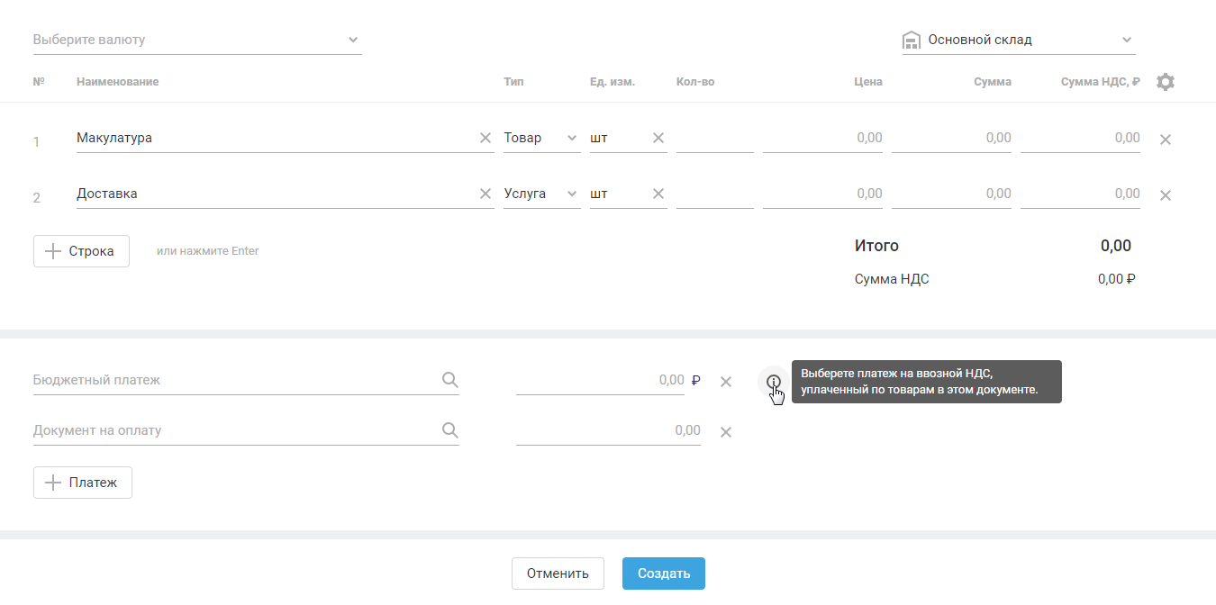 К инвойсу вы можете добавить бюджетный платёж на «ввозной» НДС, уплаченный по товарам в этом документе.