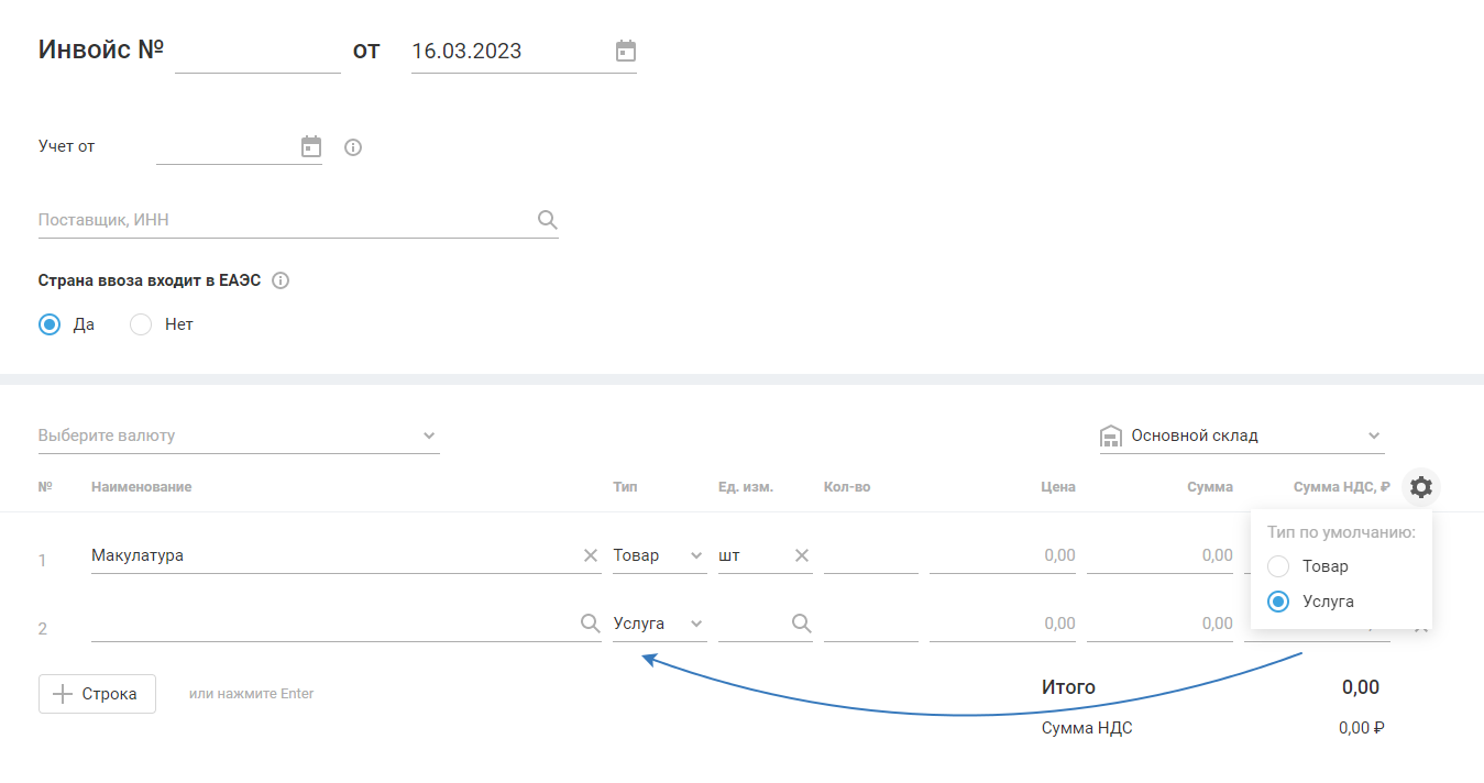 10. Значок шестерёнки - нажимая на него, вы можете выбрать тип (товар или услуга), который по умолчанию будет указываться для последующих строк таблицы и для всех последующих инвойсов до тех пор, пока вы не поменяете в шестеренке на другой тип.