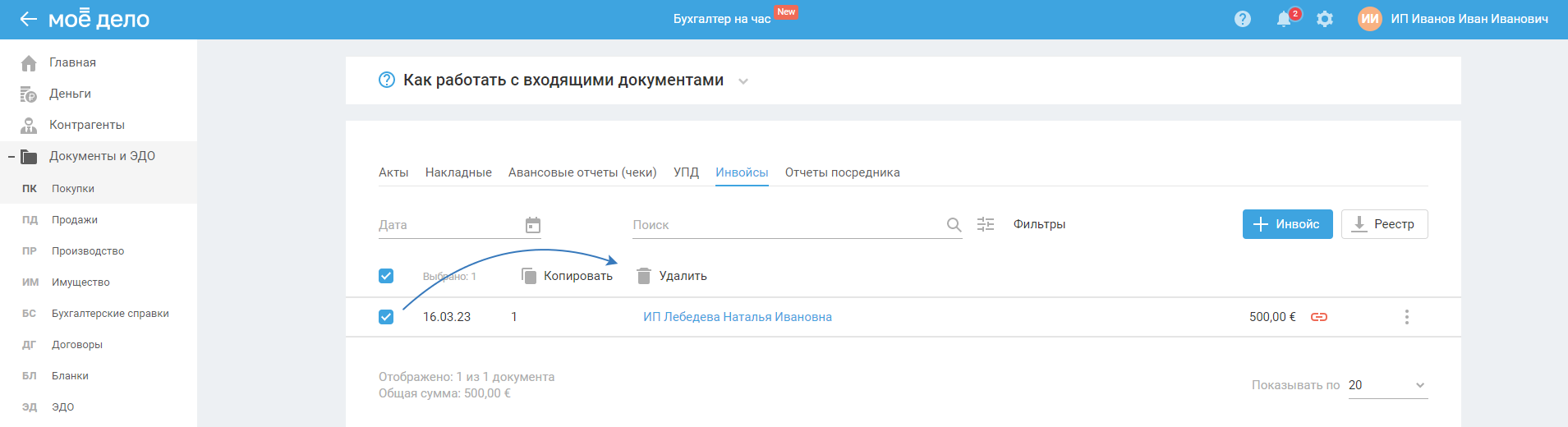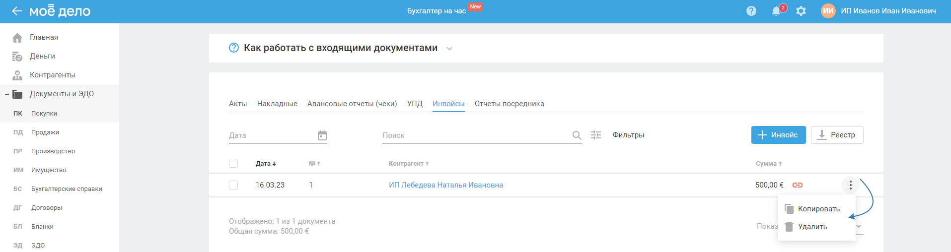 Нажимая справа от выбранного инвойса на значок три точки или выделив его галкой , вы можете: