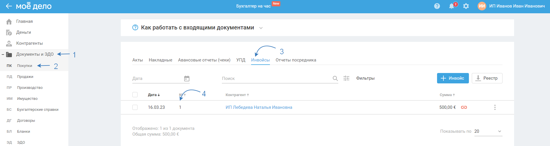 Созданный инвойс отражается в таблице созданных документов в разделе «Покупки — Инвойсы» за выбранный период.