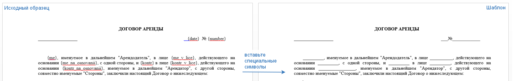 Откройте образец своего договора и замените указанные поля на соответствующие символы. Вводиться специальные символы должны вместе с фигурными скобками.