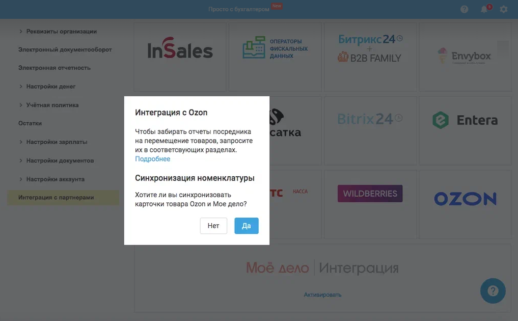 После включения интеграции откроется диалоговое окно, где вам будет предложено синхронизировать карточки товара Ozon и Моё дело.