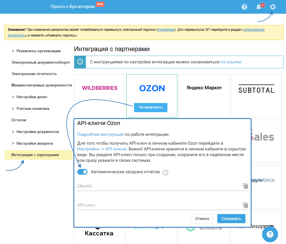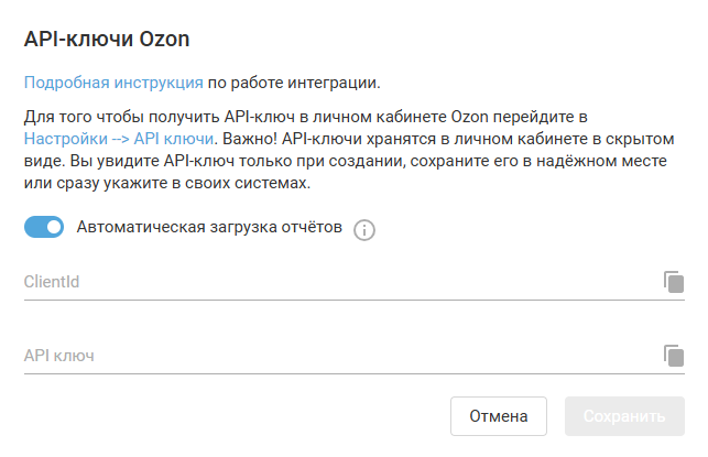 Подключение интеграции. OZON