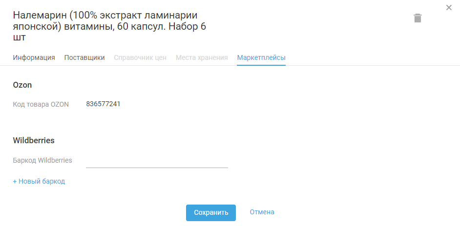 Если товар не нашёлся, то поиск продолжится по наименованию товара. Если в карточке товара не указан код товара OZON, то при синхронизации номенклатур данное поле заполнится автоматически: