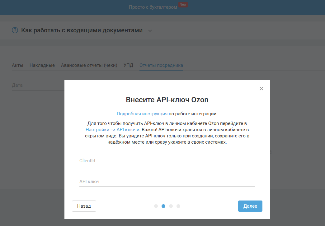 - Для настройки интеграции с Ozon сформируйте API-ключ в личном кабинете Ozon (Настройки — API ключи) и внесите данные: