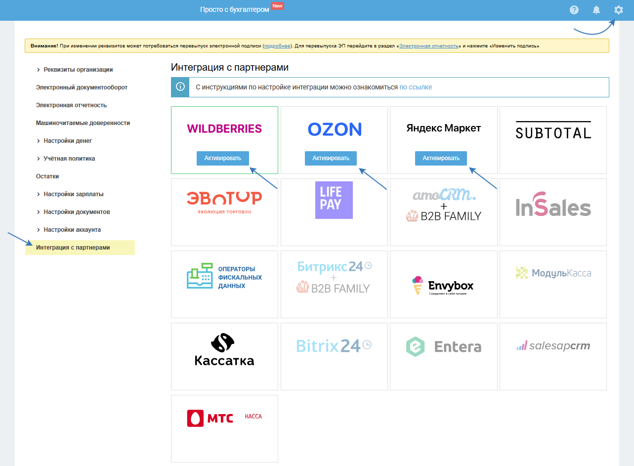 Для подключения интеграции пройдите в раздел «Реквизиты — Интеграция с партнёрами», выберите нужный маркетплейс и нажмите на кнопку «Активировать»: