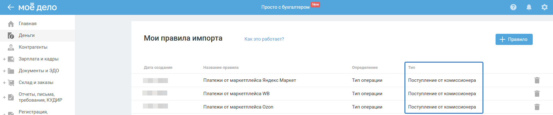 Обратите внимание. При включении интеграции с маркеплейсами (МП) или запросе отчёта посредника в сервисе автоматически создаётся правило импорта в Деньгах с типом «Поступление от комиссионера»: