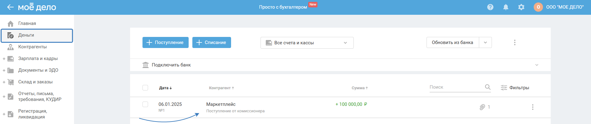 Далее в разделе «Деньги» необходимо отредактировать поступление от комиссионера МП на сумму за вычетом суммы выкупа: