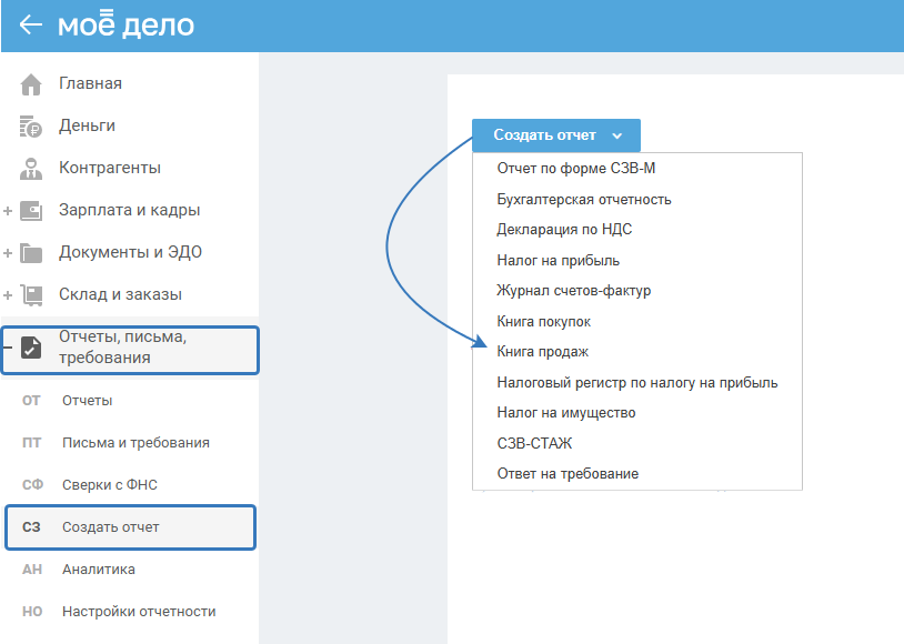 После того как был создан счёт-фактура или УПД со статусом 1, данная продажа отразится в книге продаж и будет участвовать в расчёте налога НДС. Скачать книгу продаж вы можете в разделе «Отчёты, письма, требования»: