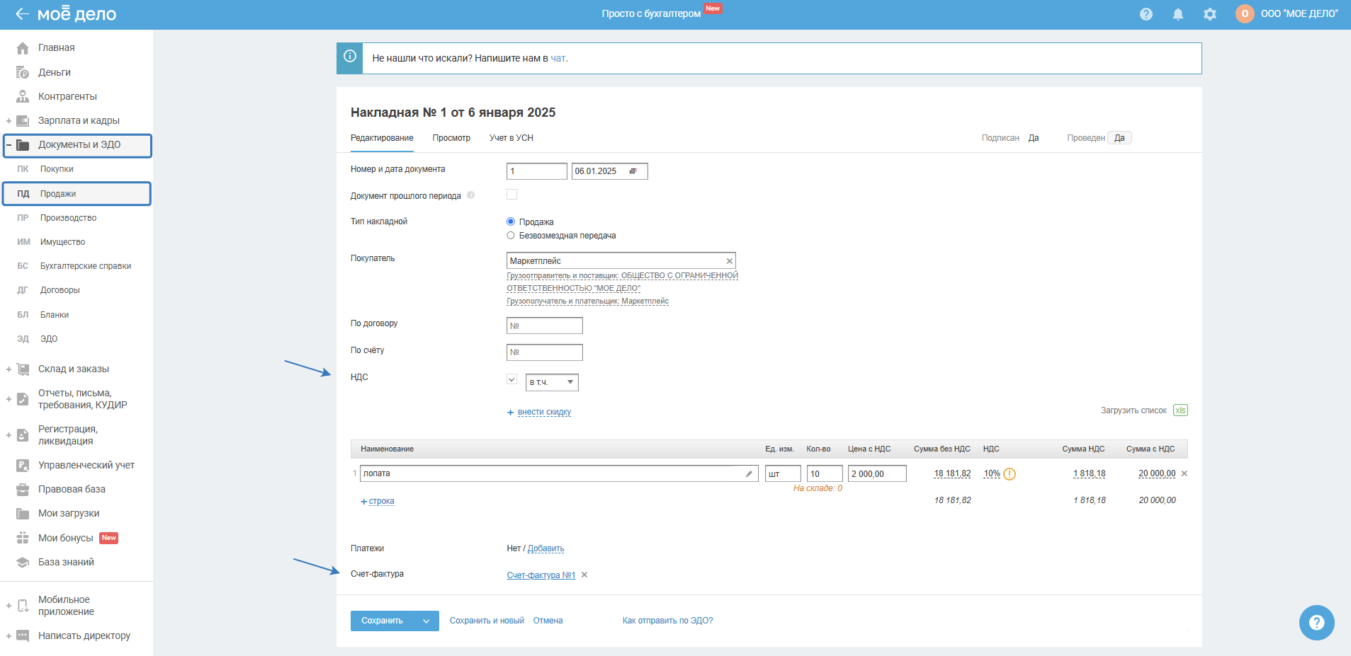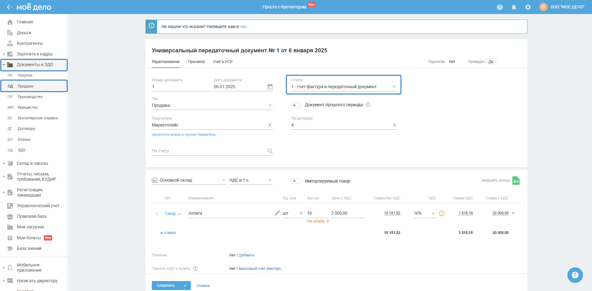 Теперь по реализации с признаком в поле «Продажи» юр. лицо необходимо создать в разделе «Документы и ЭДО — Продажи» накладную со счёт-фактурой или УПД со статусом 1 по данной продаже: