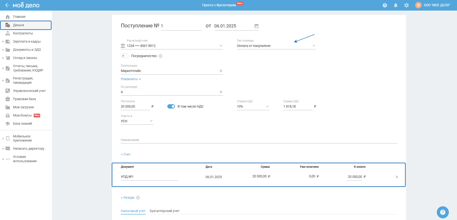 Затем создать поступление от МП с типом «Оплата от покупателя». В поступлении указать ранее созданный документ. Если ранее создавали УПД со статусом 1, то привязываете его, если накладную + счёт-фактуру, то привязываете накладную, связанную со счётом-фактурой: