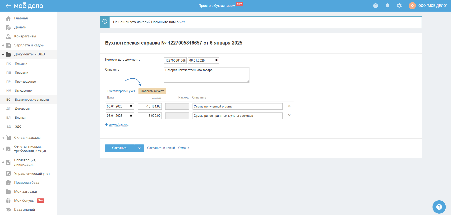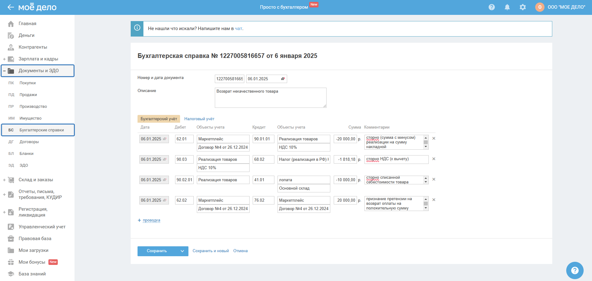 Так как при возврате некачественного товара схемой обратной реализации воспользоваться нельзя, необходимо в разделе «Документы — Бухгалтерские справки» создать справку. Допустим, стоимость продажи составила 20 000 руб., в т.ч. НДС 10% — 1 818,18 руб. Получили от покупателя претензию на возврат. Тогда: