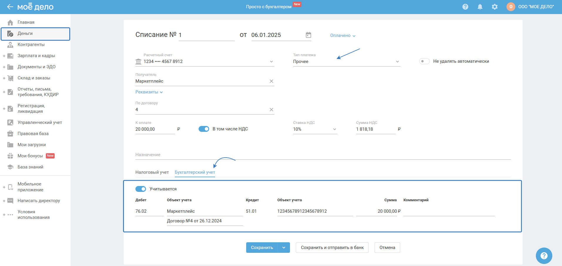 Далее необходимо отразить возврат денег покупателю. Для этого нужно создать Списание в разделе «Деньги» с типом Прочее. Налоговый учёт не заполняем. Бухгалтерский учёт по дебету выбираем счёт 76.02 (контрагент и договор как в бух.справке):