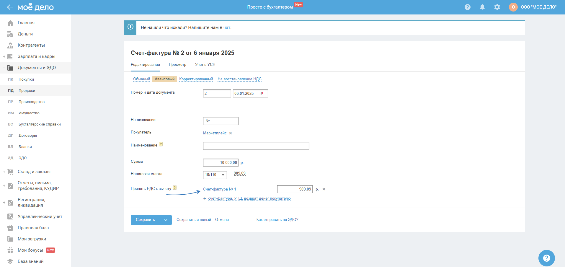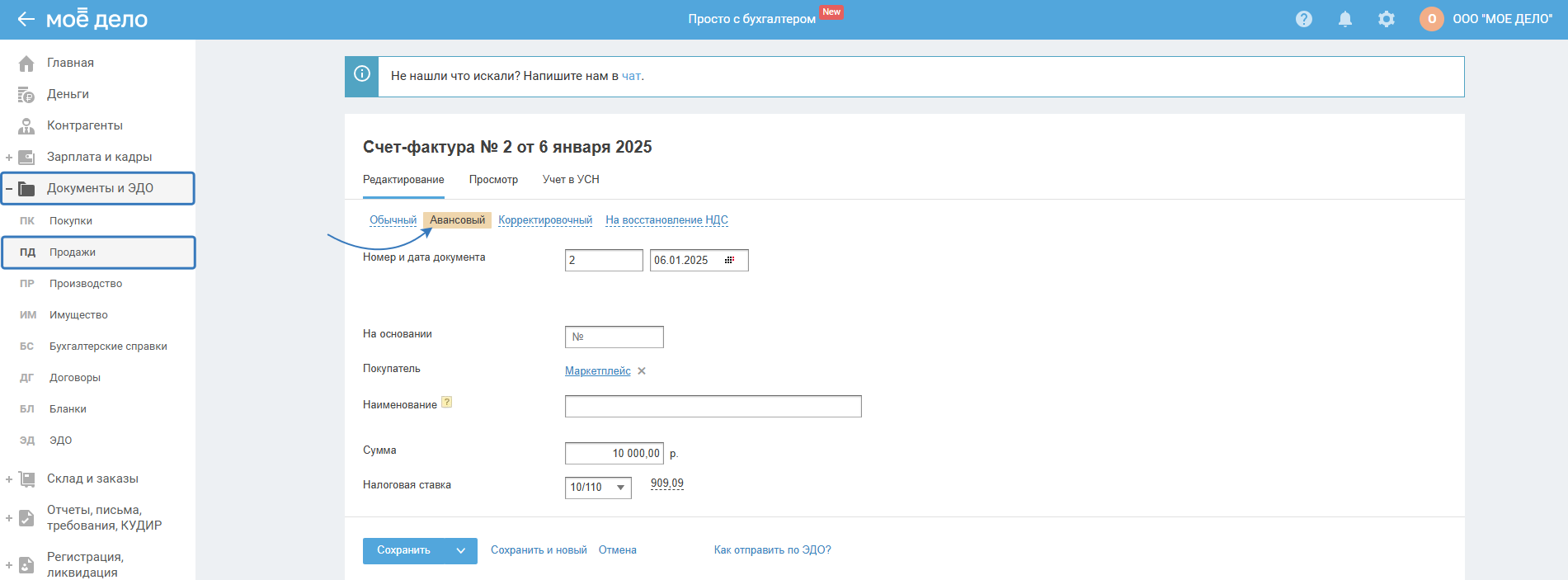 Если таковые отчёты имеются в личном кабинете МП, нужно создать в разделе в разделе «Документы и ЭДО — Продажи» авансовый счёт-фактуру: