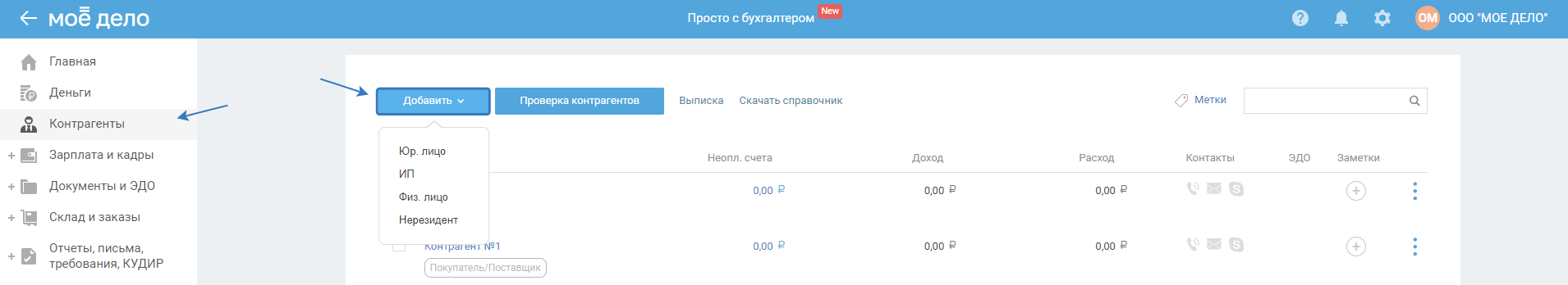 Нажмите кнопку «Добавить» и в выпадающем меню выберите «Юр. лицо»: